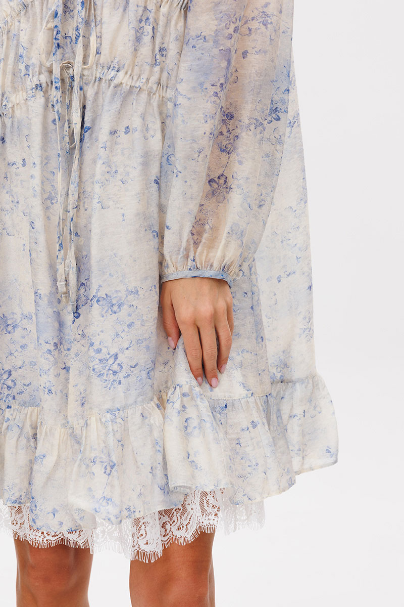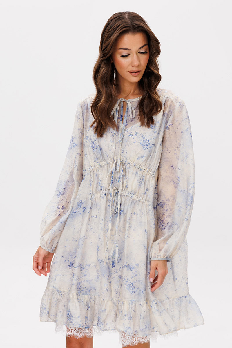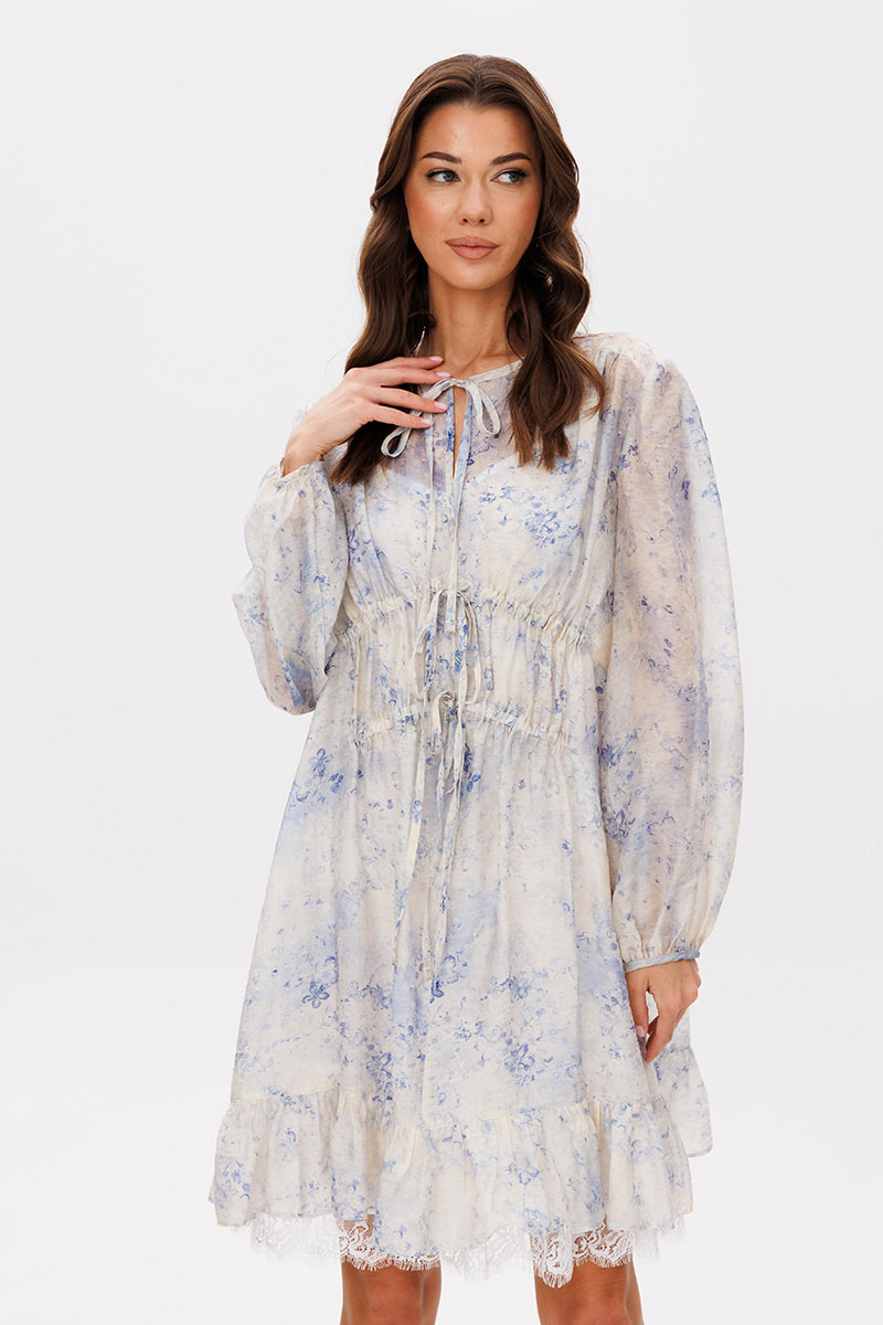 сборкой по центру. По низу платья притачной волан со сборкой. Подкладка платья из х/б батиста, на регулируемых бретелях, с притачным воланом с кружевом.