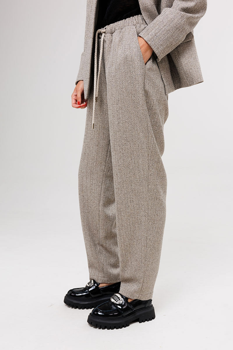 Брюки свободные, на эластичном поясе с люверсами и отделочным шнуром. Передние половинки с боковыми накладными карманами.