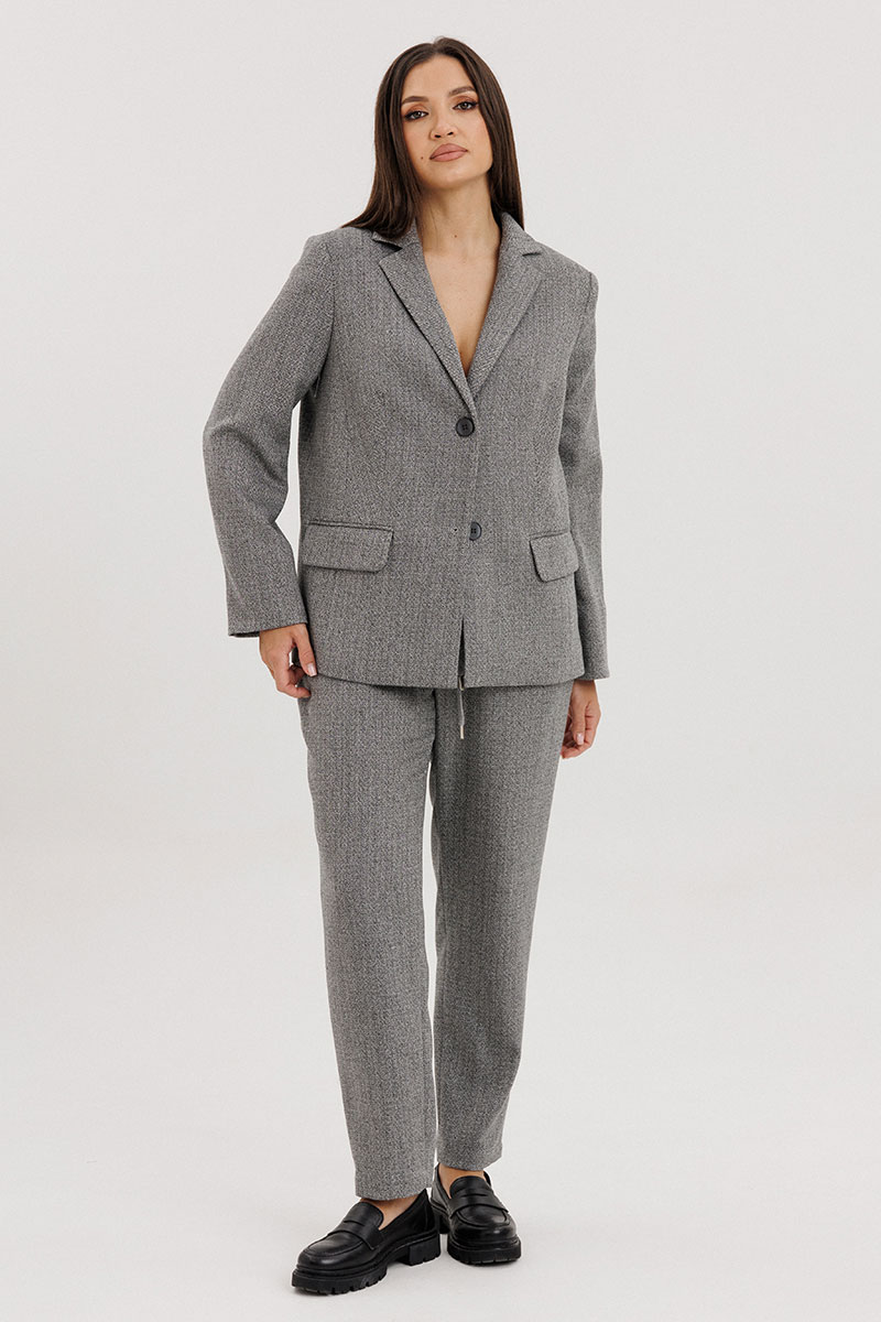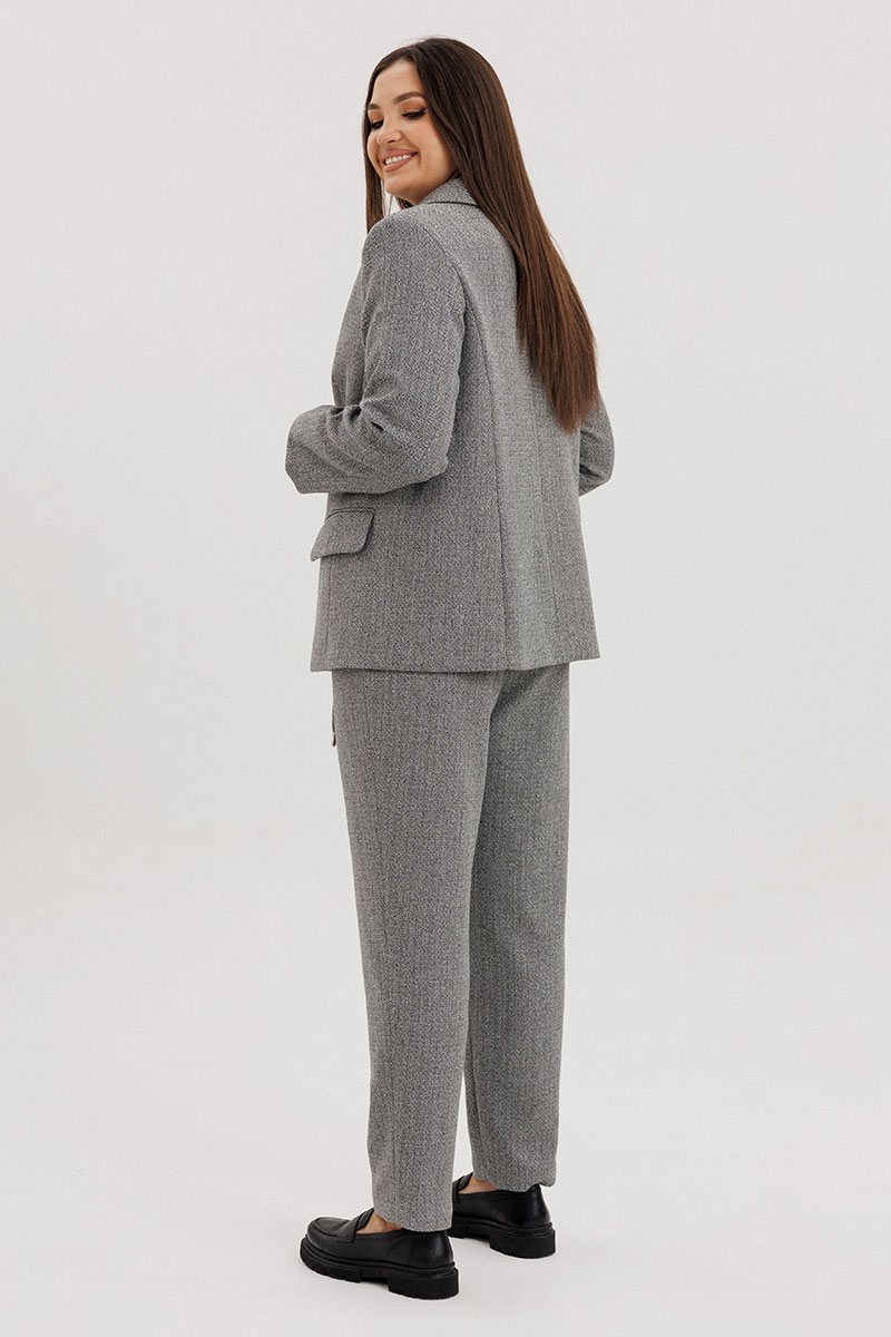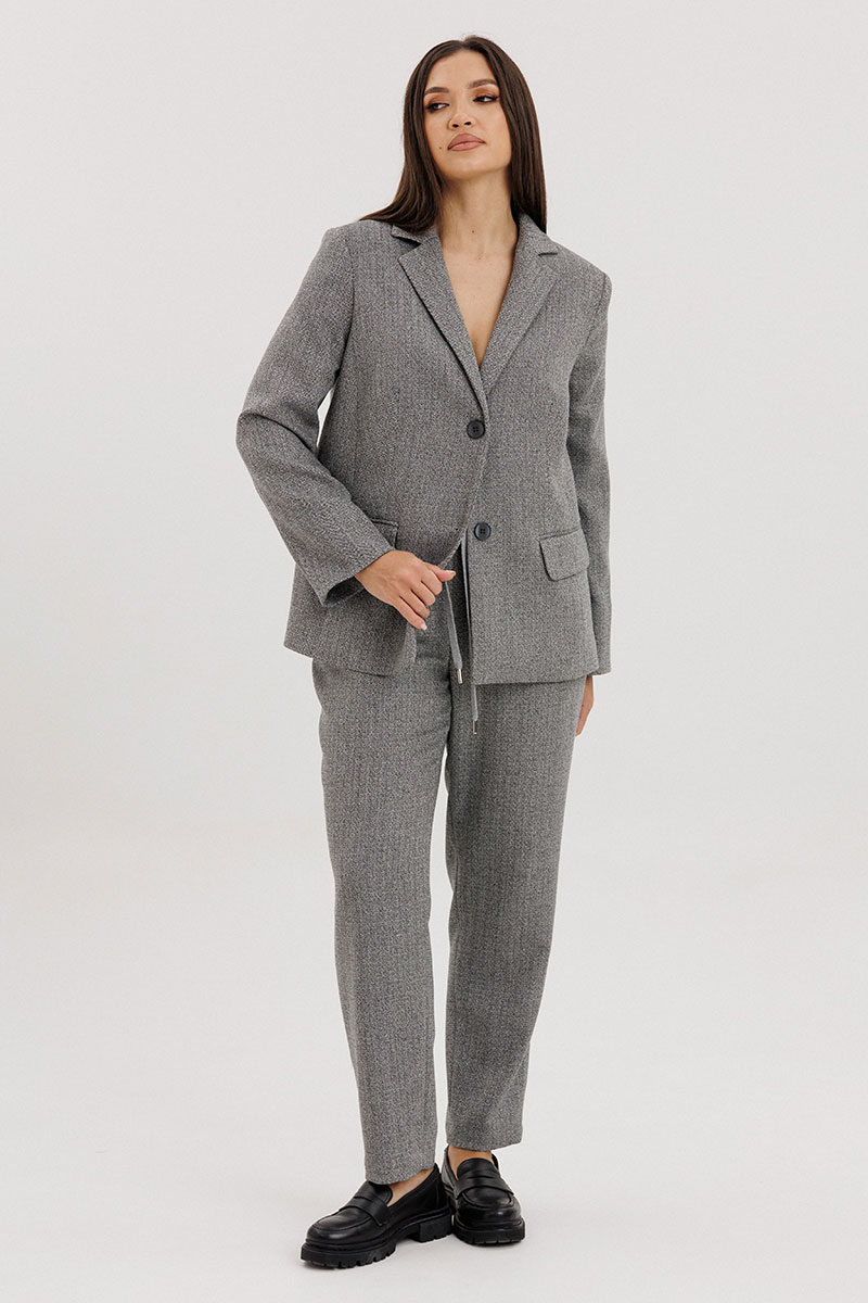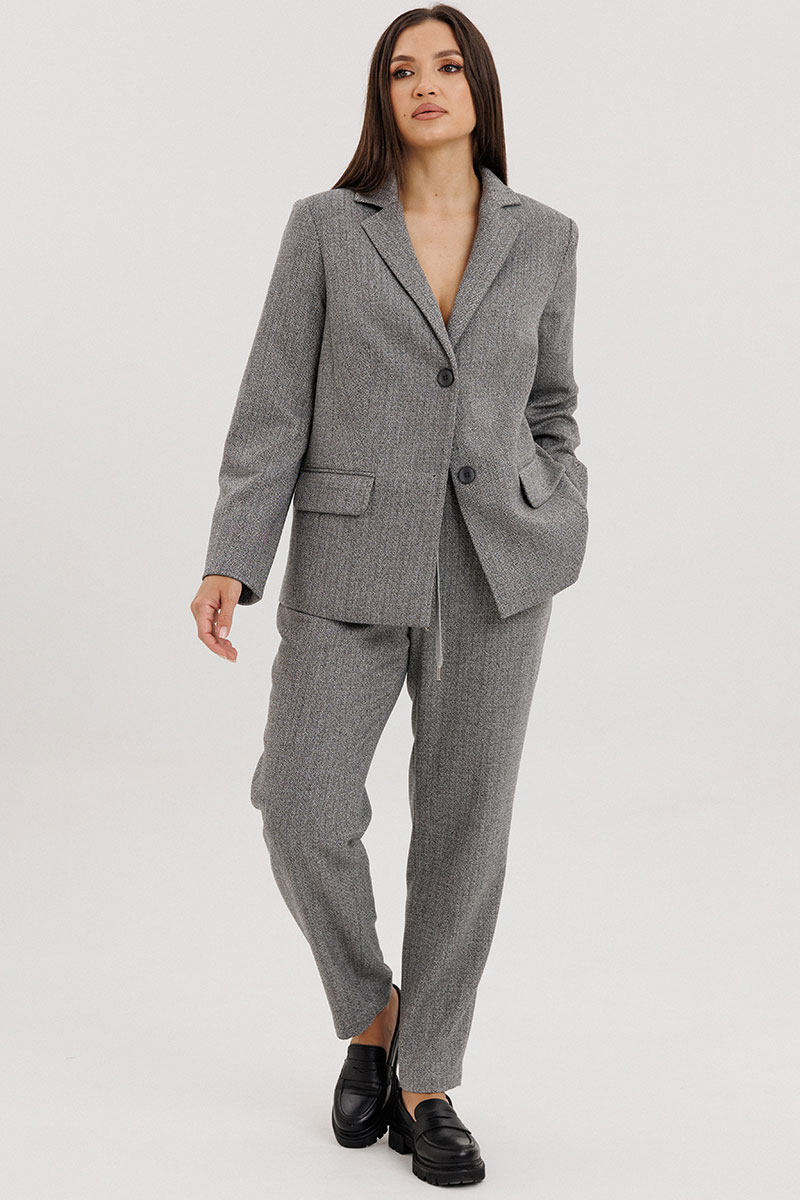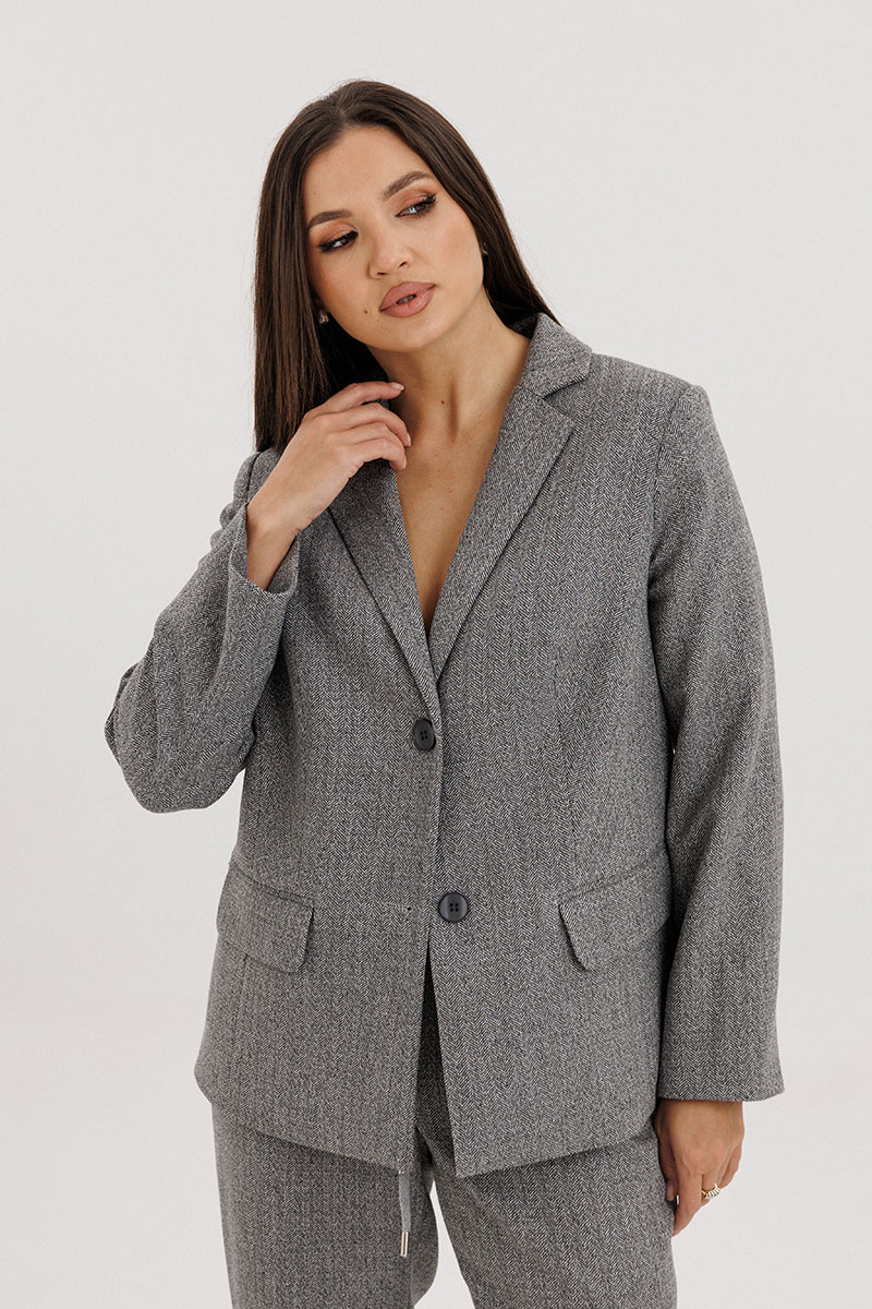 Силуэт свободный, слегка упрямлённый, покрой-втачной, воротник классический английский, линия борта фигурная, застёжка на две петли и пуговицы. Полочка с отрезным бочком, нагрудной