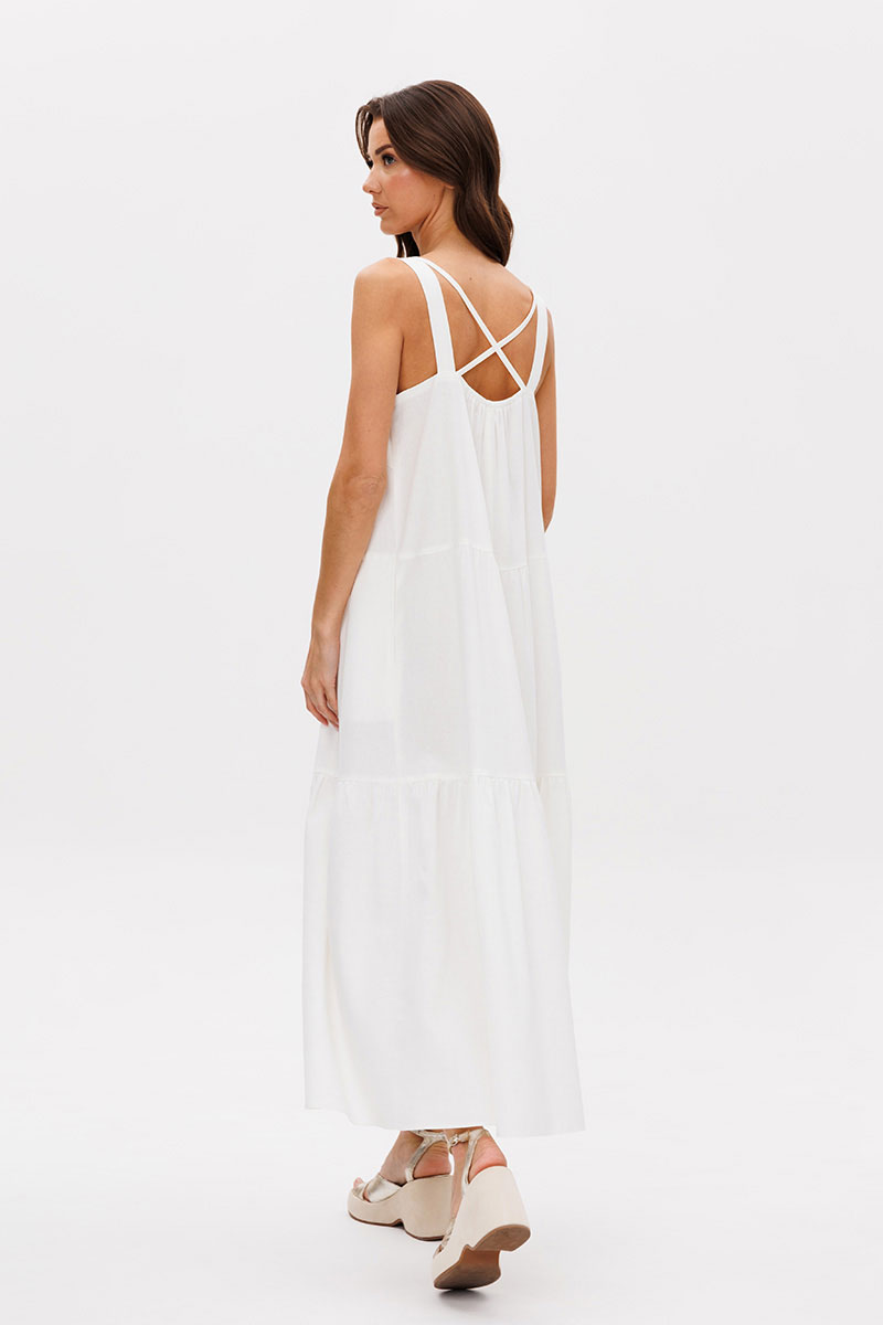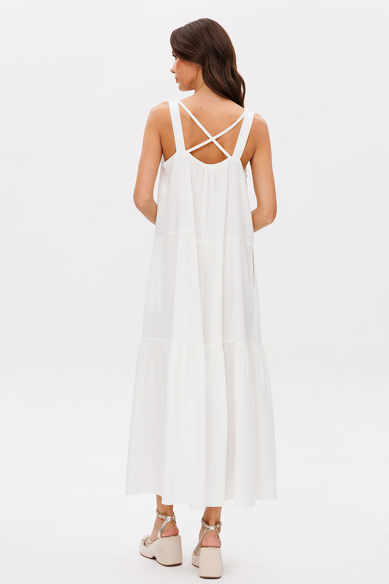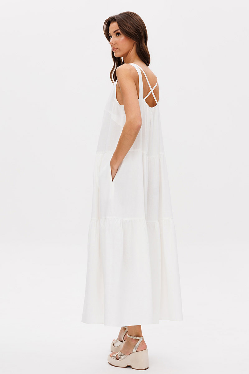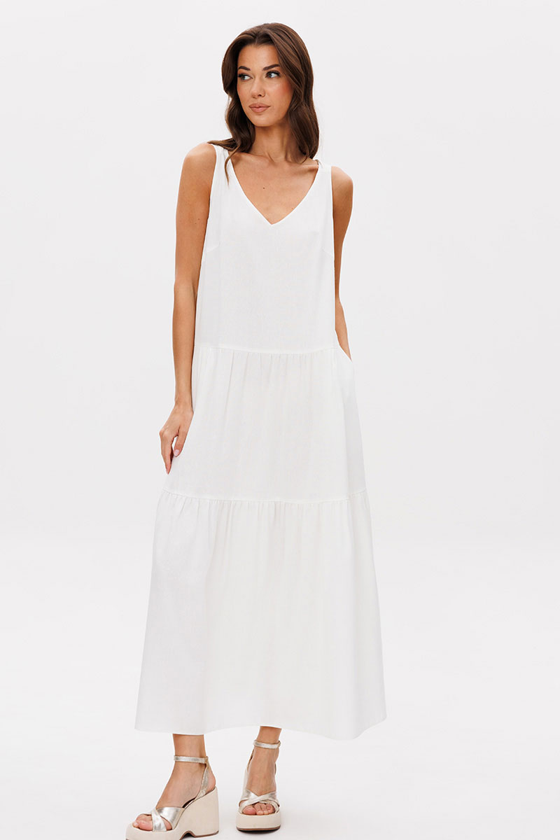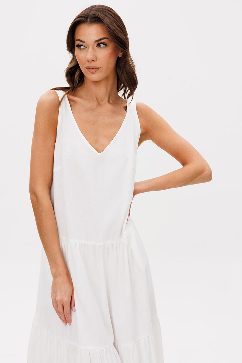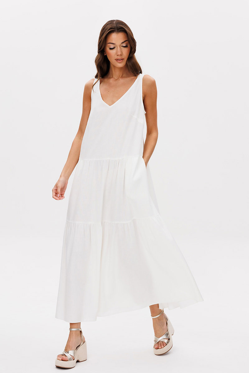 Лето -пора эффектных и максимально открытых платьев, а белый летний сарафан изо льна-символ легкости и безупречности, комбинация экологичности и модного акцента. Максимальная длина, А-силуэт, горизонтальные воланы с частичной сборкой, карманы в боковых швах, V-образный вырез на лифе. Верхняя часть полочки с нагрудной вытачкой. По верхнему срезу спинки-эластичная вставка. Модель отличает необычное расположение разноширинных шлеек, оригинально перекрывающихся на спинке.