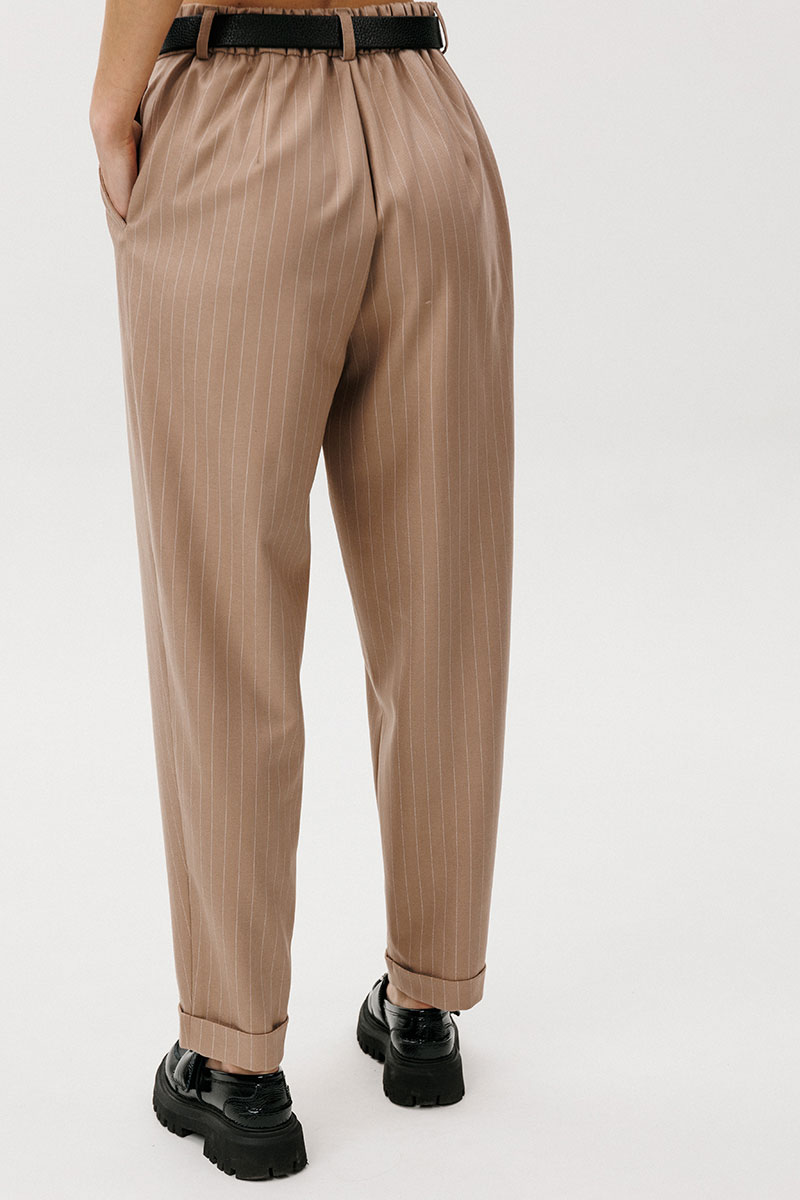 Брюки современного кроя, свободные вверху и зауженные к низу на притачном поясе со шлевками, эластичном в области спинки. Передние половинки брюк с наклонным боковым карманом и