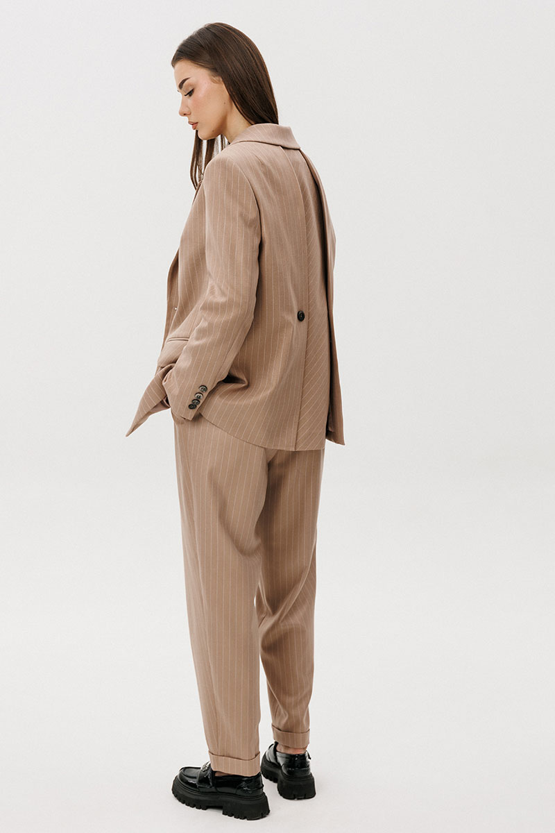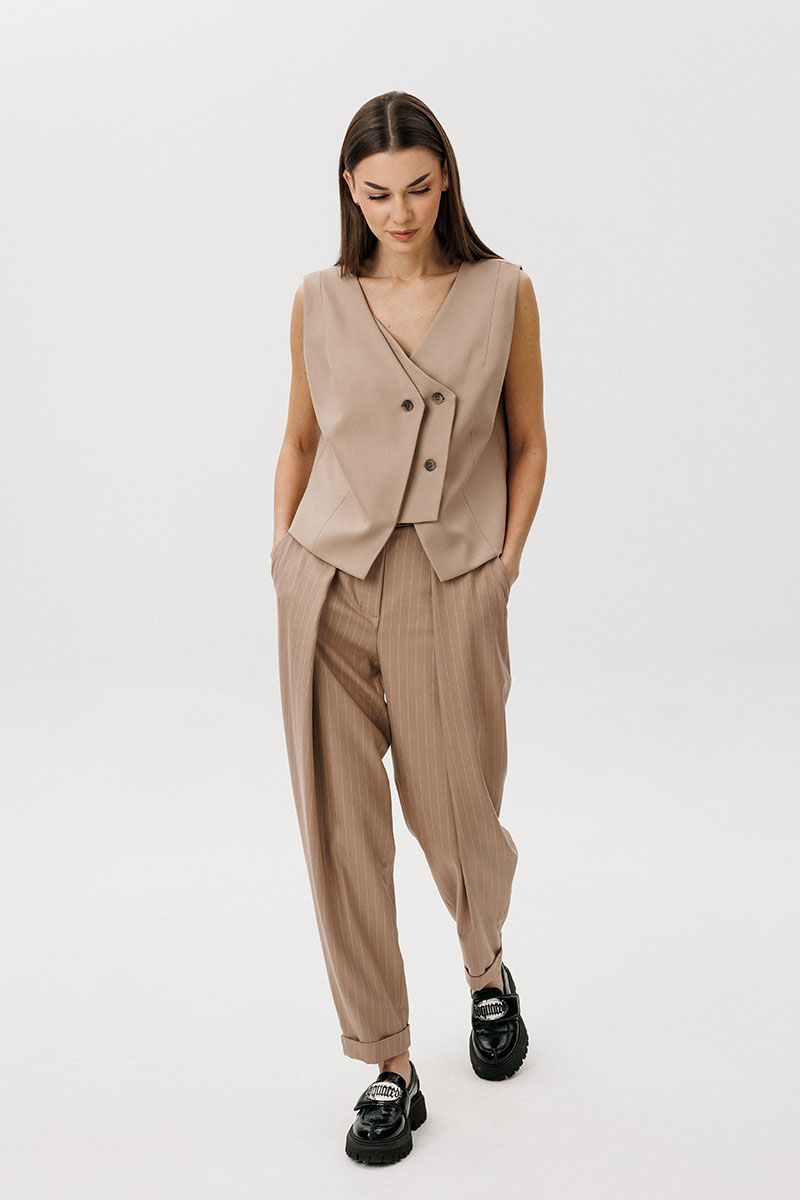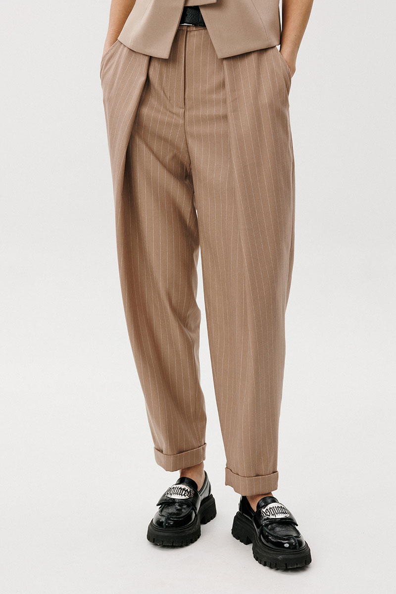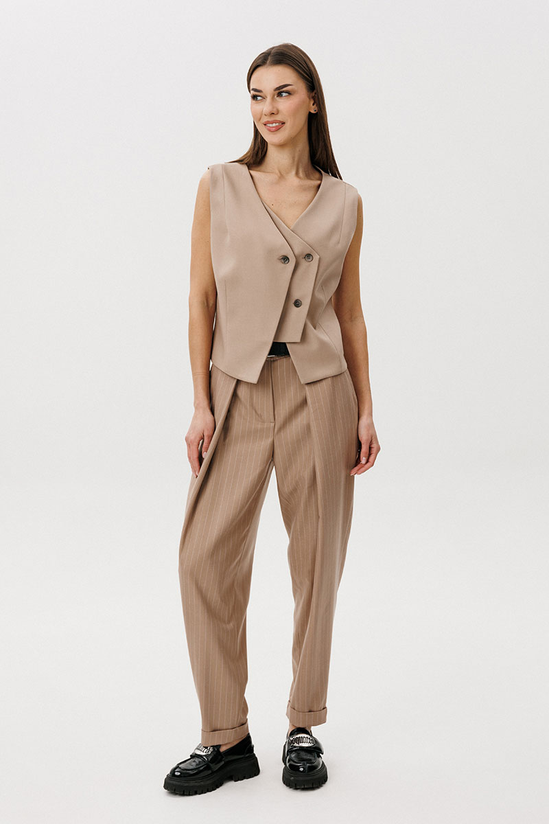 большой односторонней складкой, визуально преобразующей прямую полоску в наклонную от центра передних половинок к боковому шву. Задние половинки брюк с талиевыми вытачками. По низу