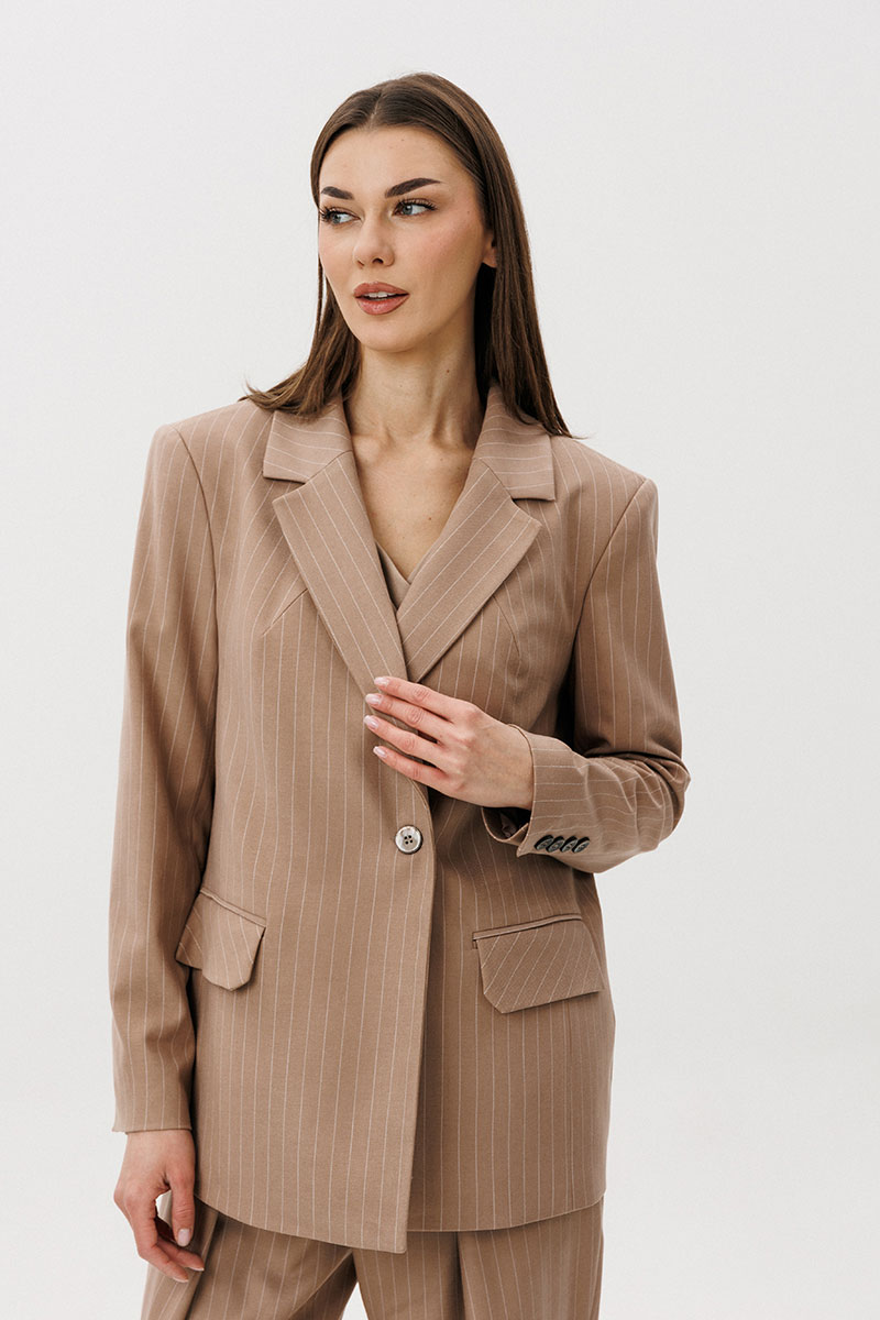 Жакет свободного упрямленного силуэта, втачного покроя, со смещенной застежкой и классическим английским воротником. Полочка с нагрудной вытачкой от линии лацкана, меняющей