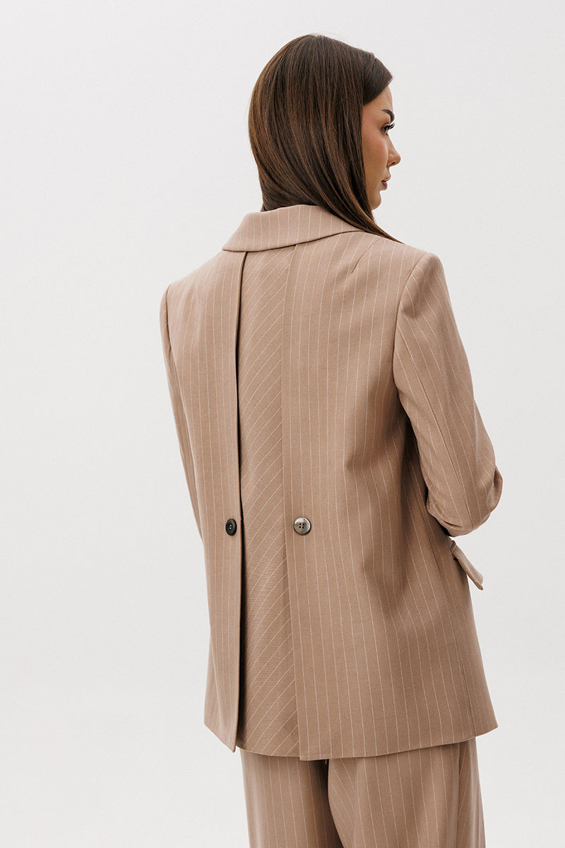 Спинкка с плечевой вытачкой и двумя необычными шлицами, идущими от горловины спинки, фиксирующимися пуговицами в области талии. Центральная часть спинки в диагональном направлении.