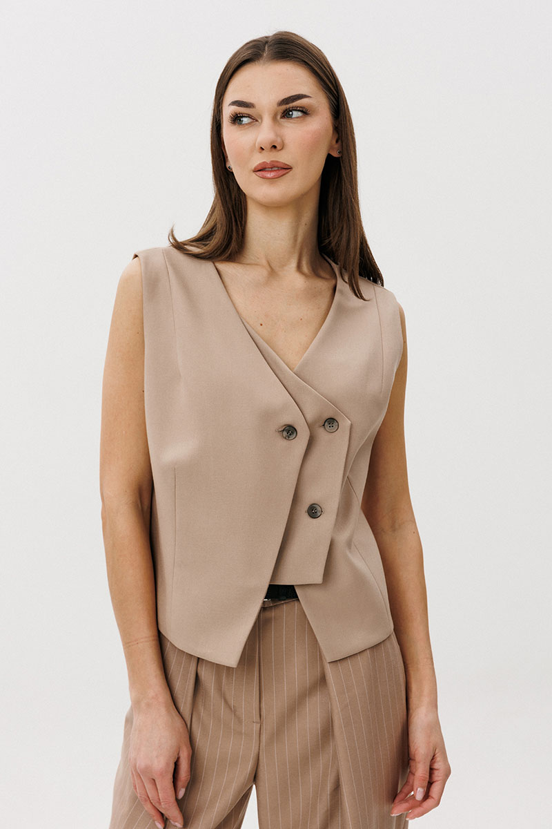 Жилет полуприлегающий, со сложным фигурным бортом, отрезным бочком, нагрудной вытачкой и средним швом и рельефом по спинке.