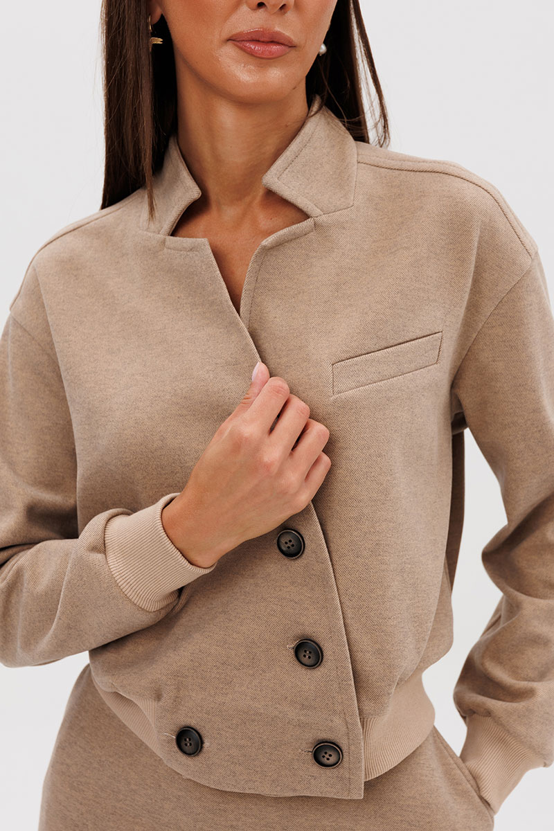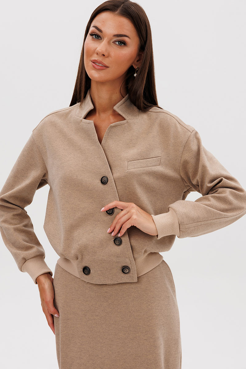 Модная расцветка, свободный покрой с заниженной линией плеча, воротник - стойка, переходящая в фигурную линию борта. Застежка - двубортная на пуговицы. По низу жакета и рукавов - трикотажный эластичный довяз.