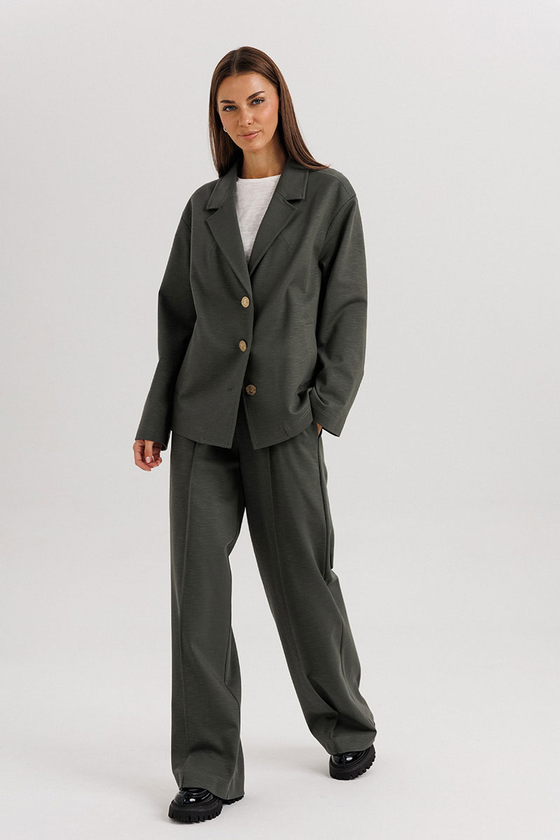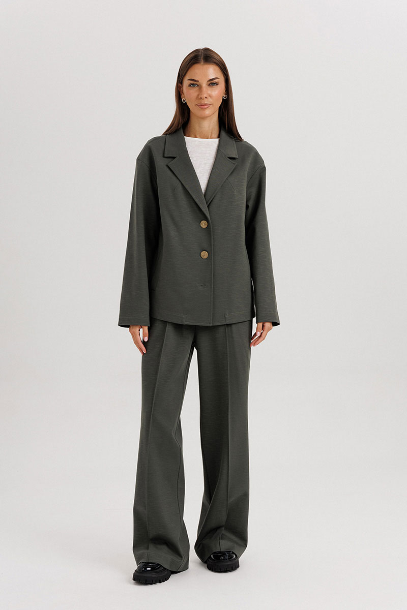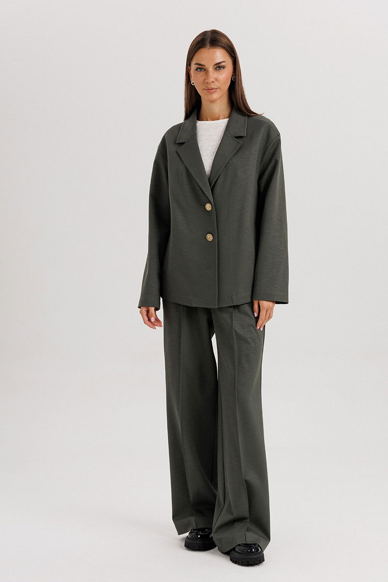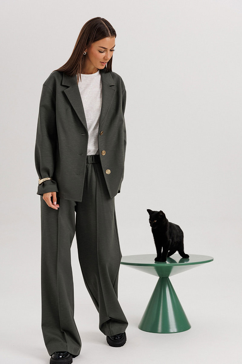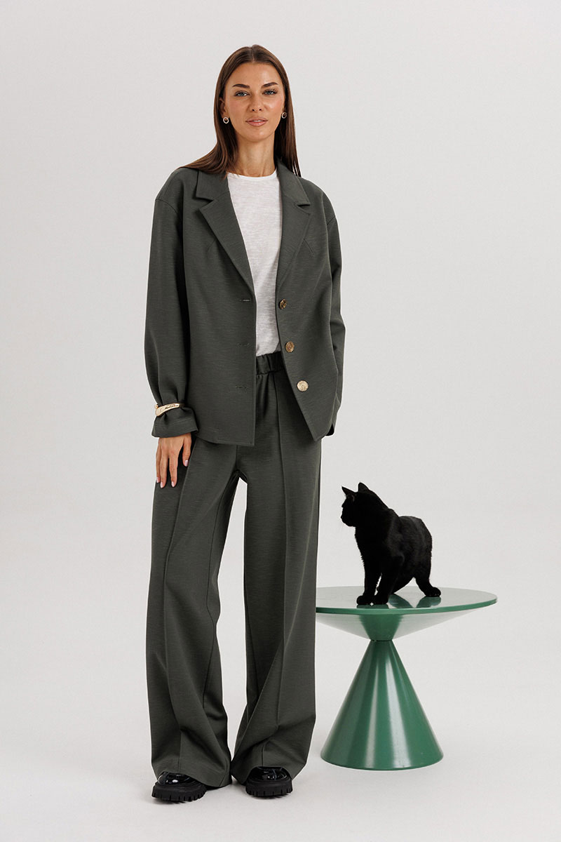 Универсальный глубокий оттенок ткани делает костюм практичным и актуальным в любое время года.