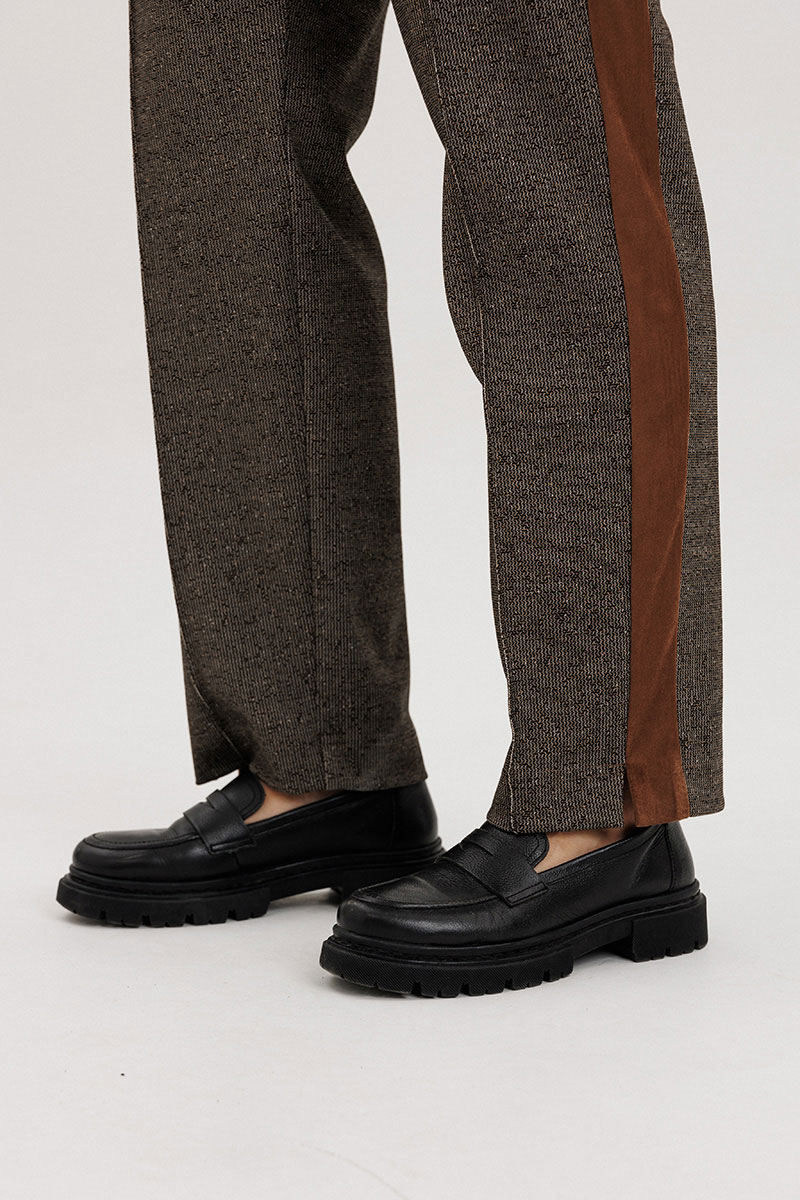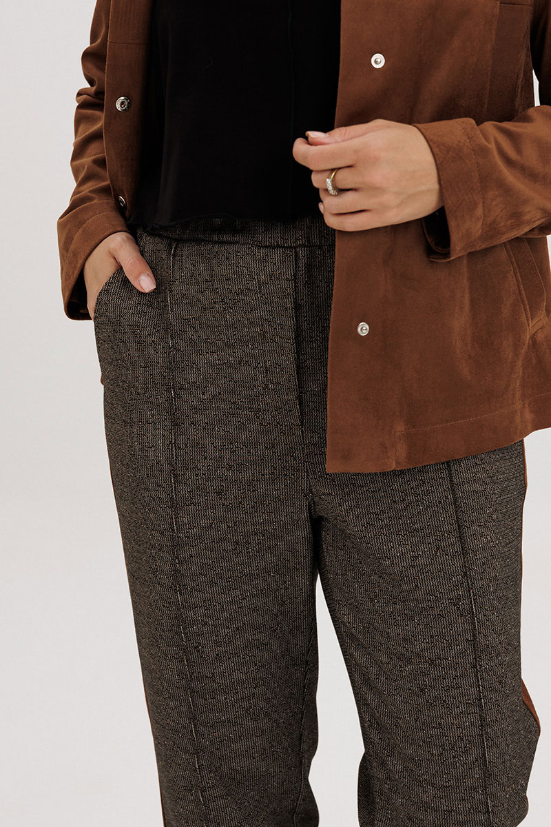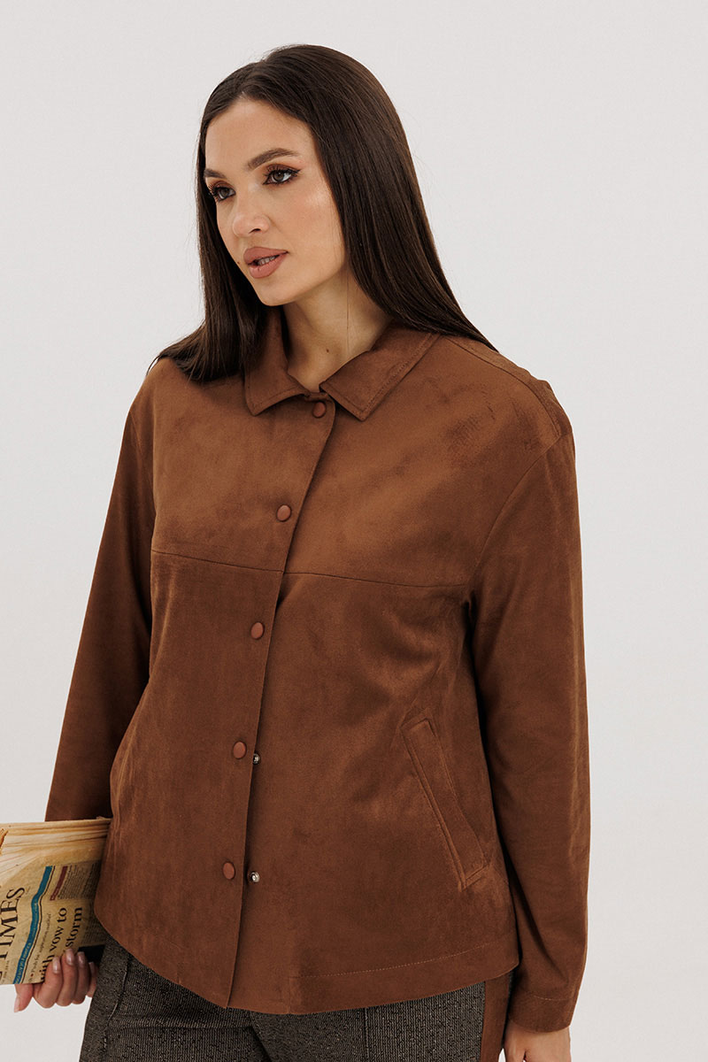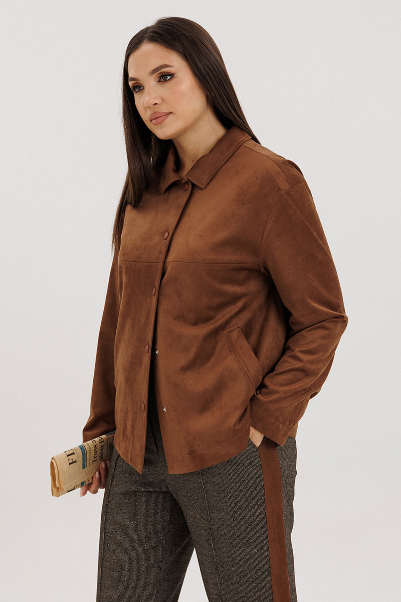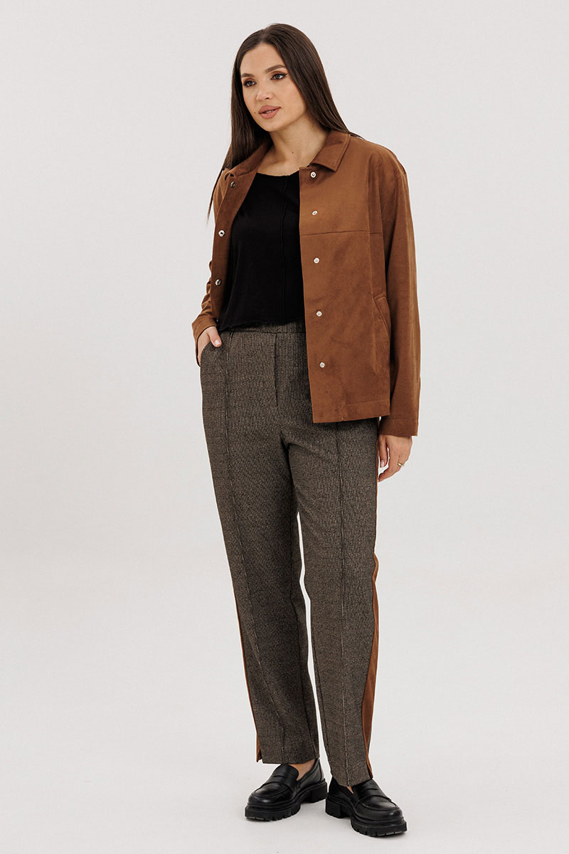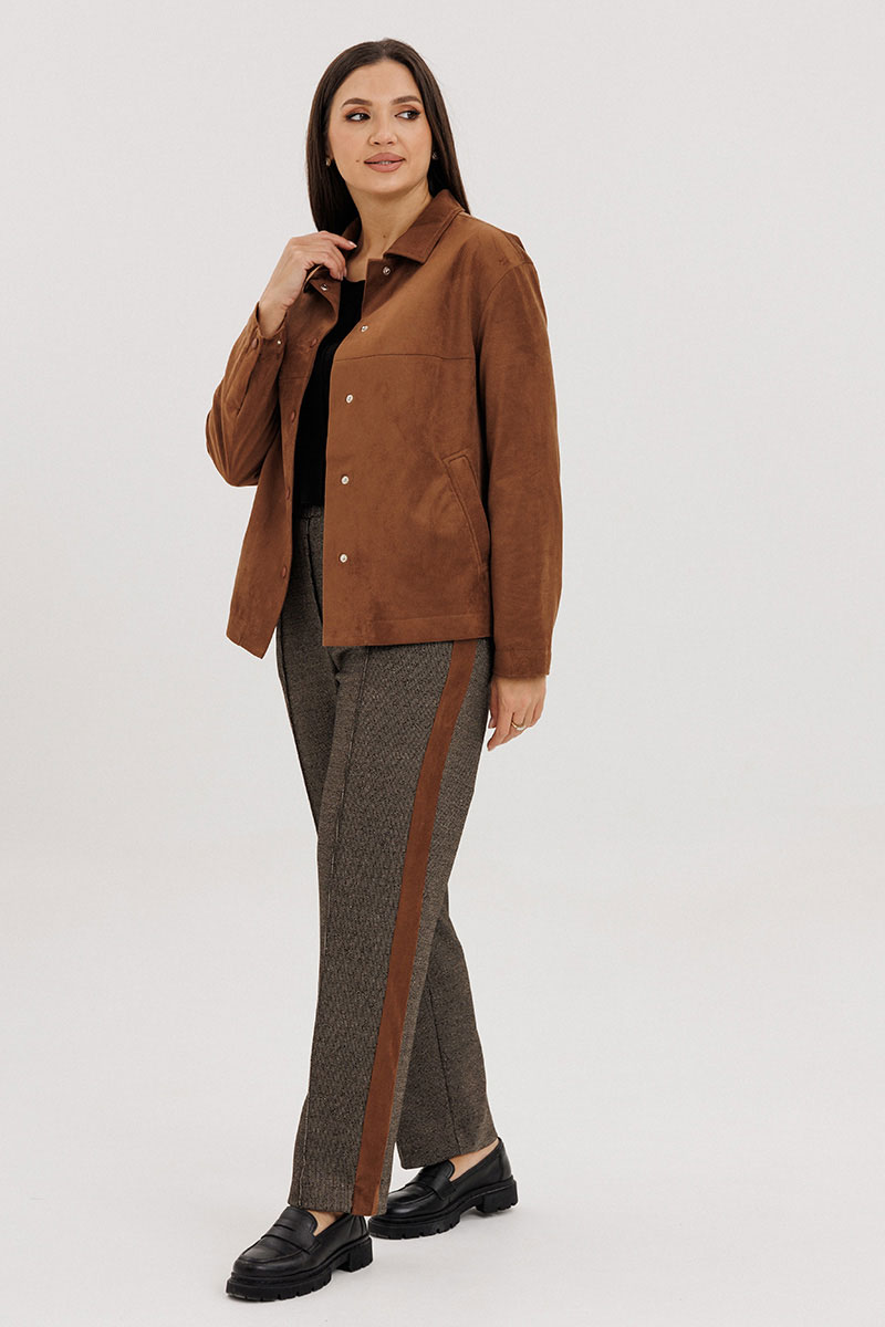 Стильный женский брючный костюм в стиле смарт-кэжуал сочетает комфорт и элегантность. Рубашка выполнена из замшевой ткани, брюки из трикотажа с декоративными замшевыми вставками. Идеальный выбор для офиса, деловых встреч и повседневных образов.