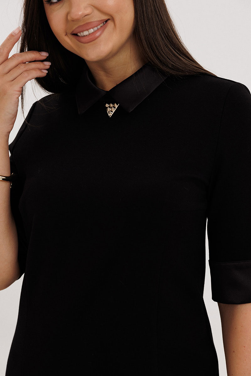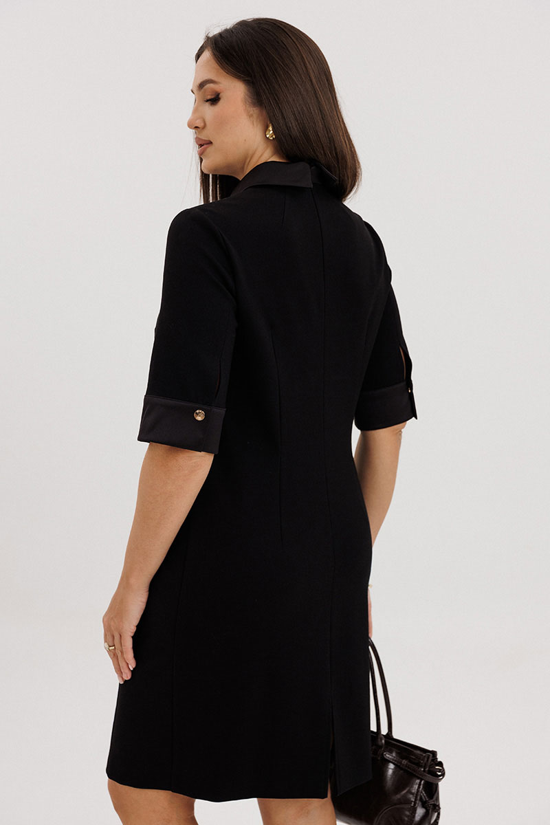 Детали: длина до колена, рукав ¾, строгий воротник с акцентной деталью.