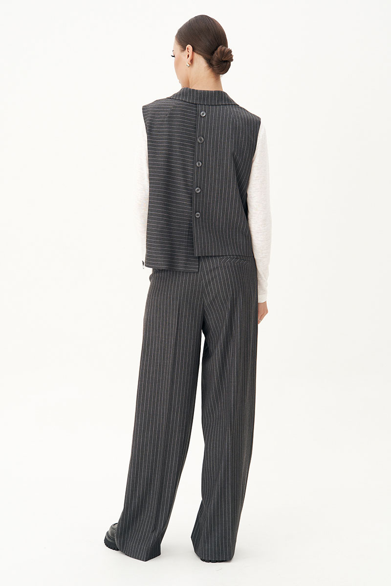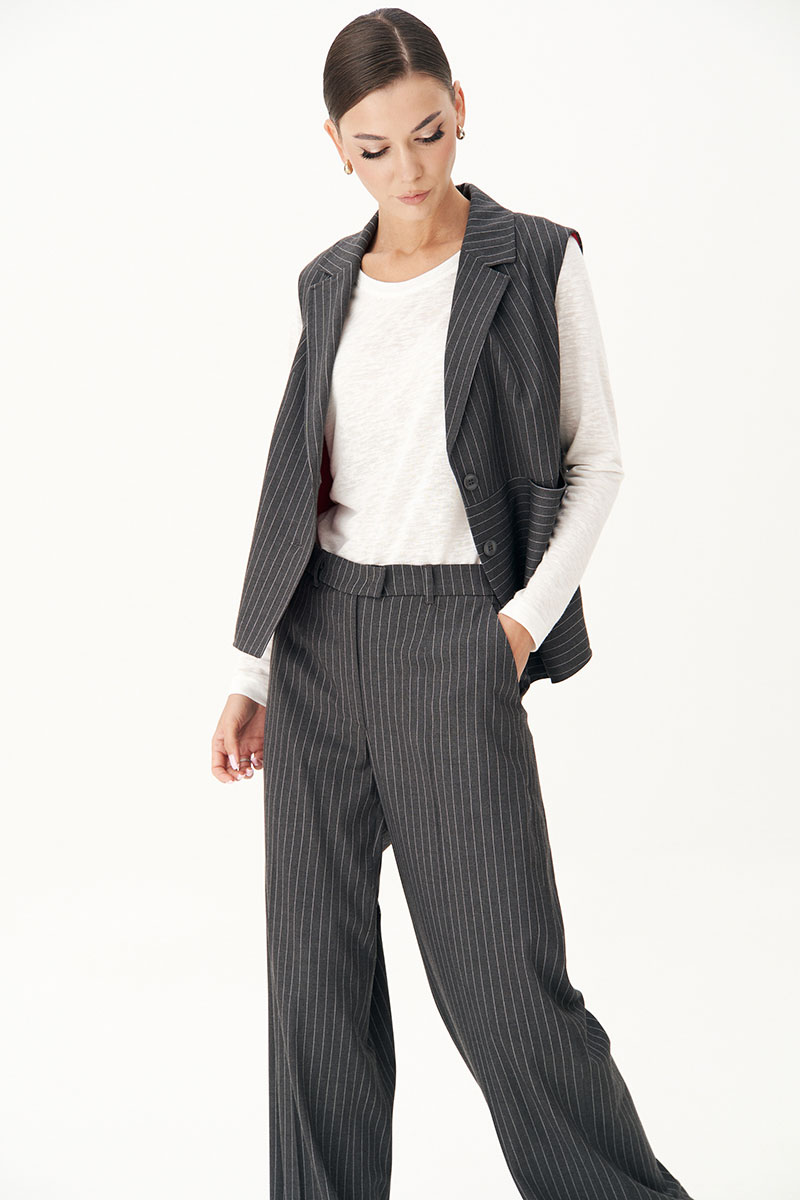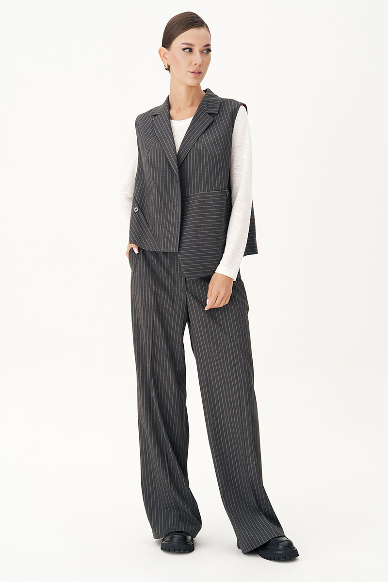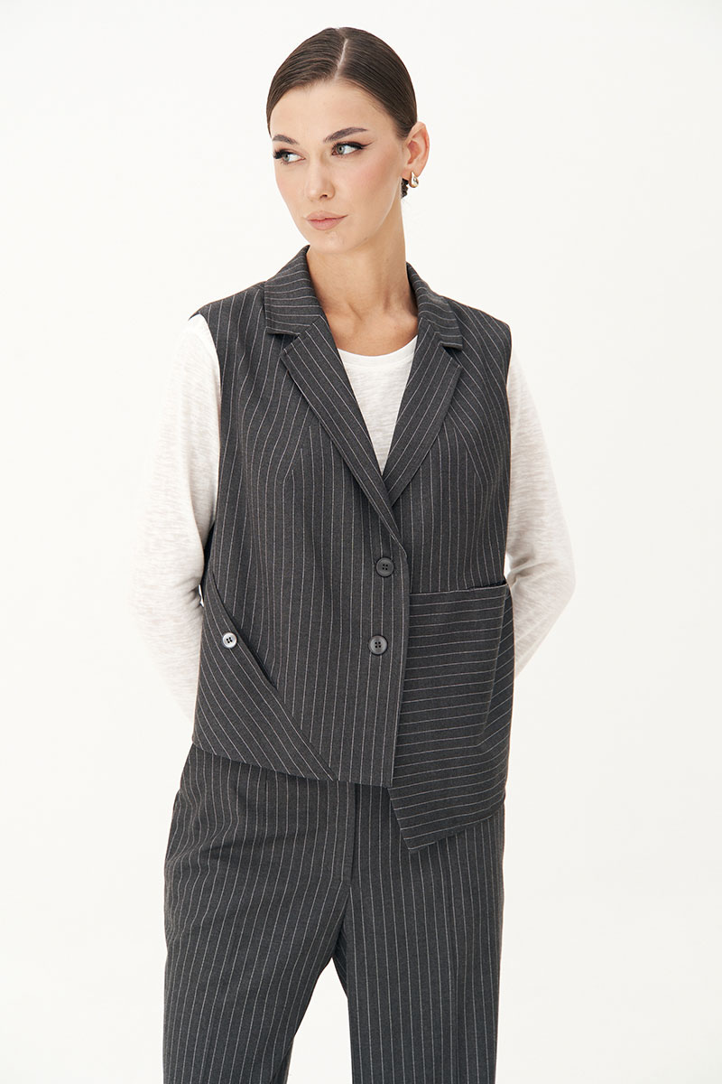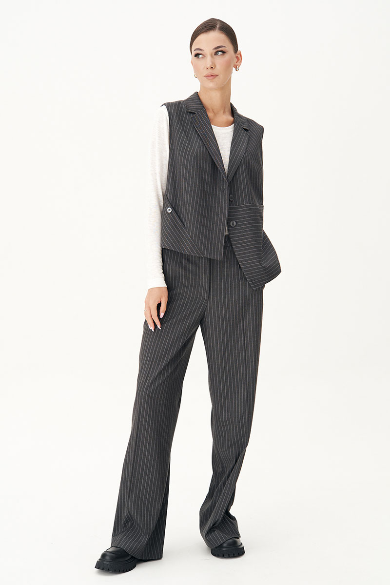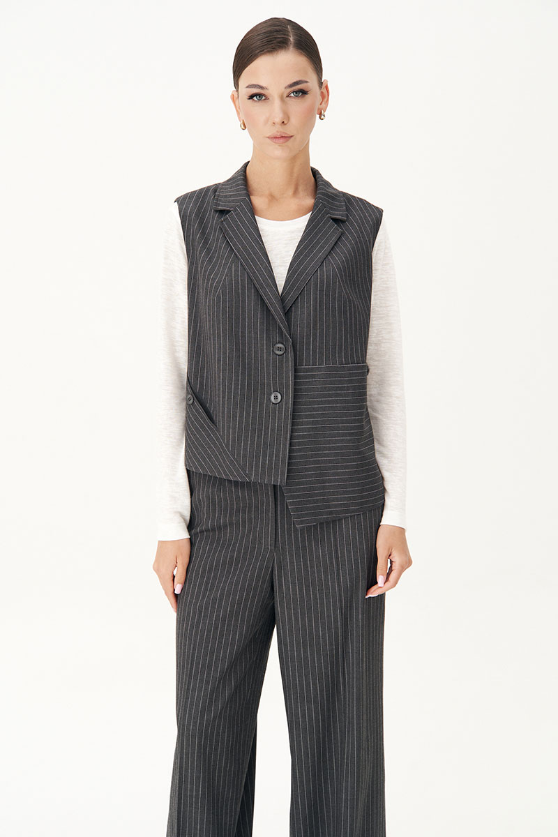Костюм с жилетом - прекрасное решение для смелых экспериментов. Выполненный в ахроматической цветовой гамме, он позволяет дополнять себя различными аксессуарами и создавать каждый раз новые актуальные образы.