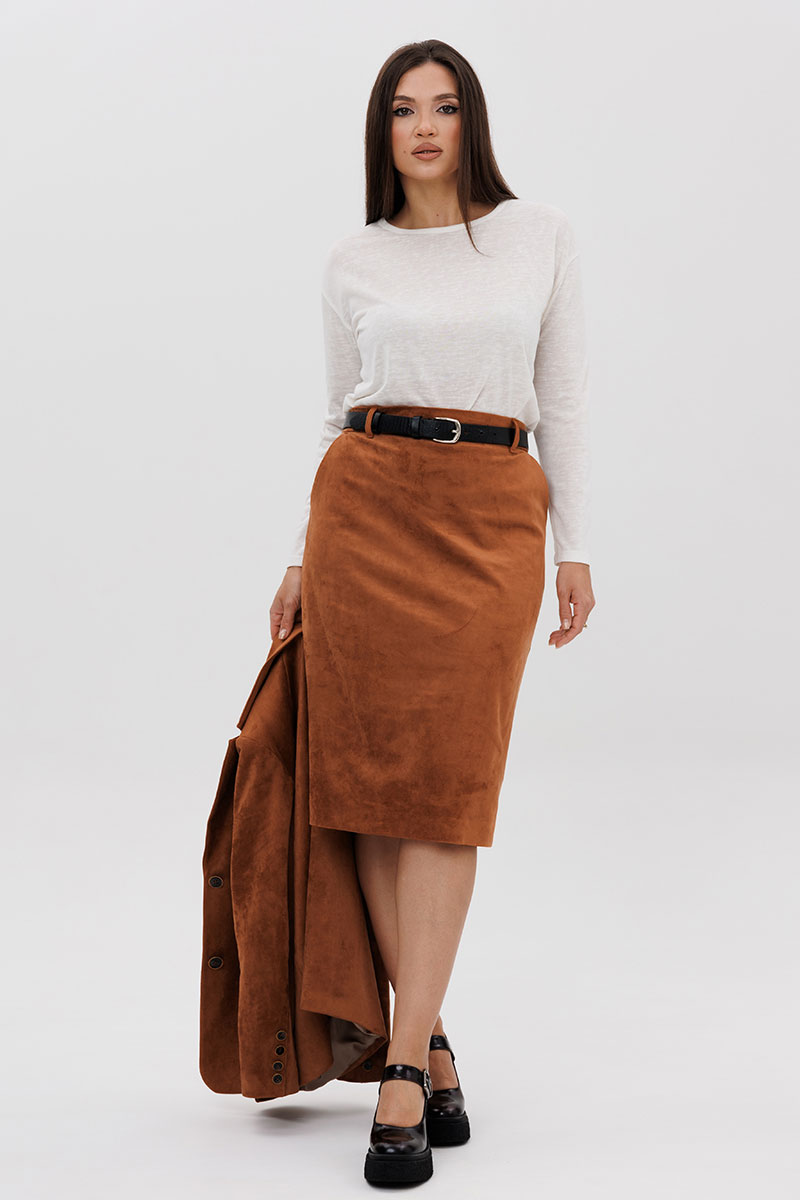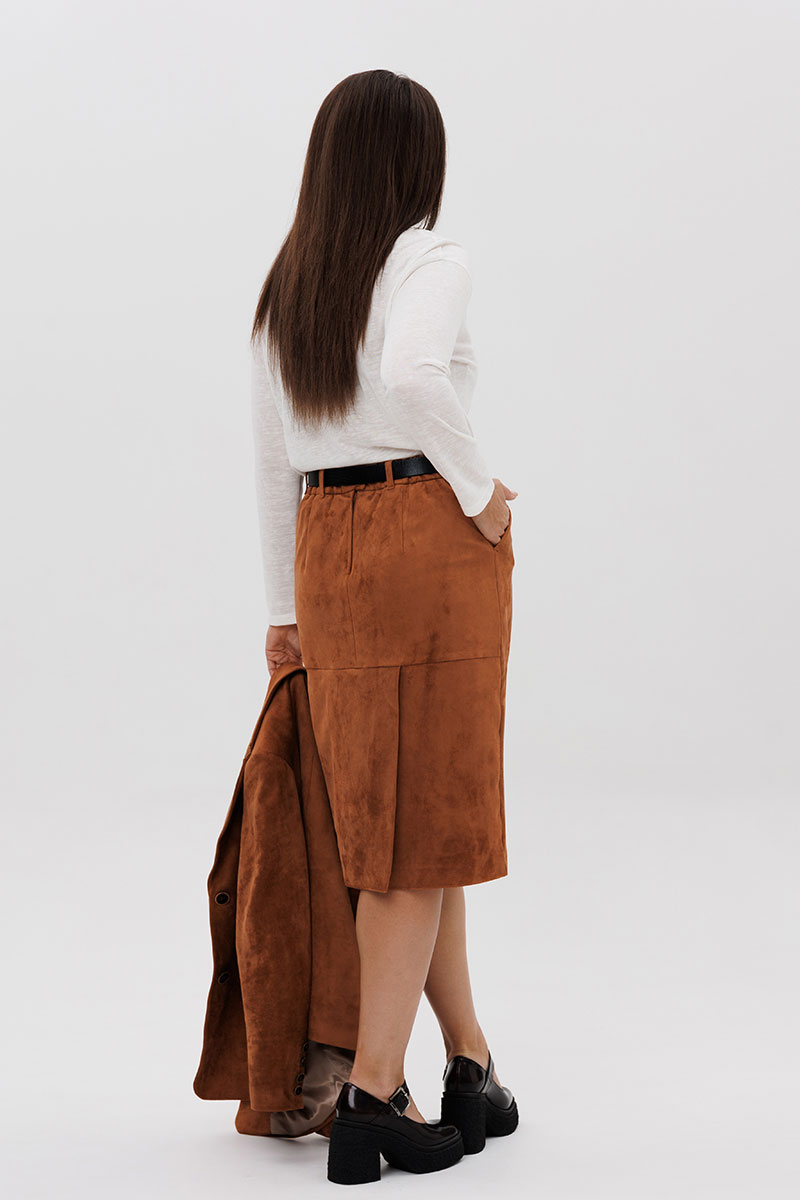 Юбка на притачном поясе, со шлевками, эластичном в области спинки, на комфортной трикотажной подкладке. Переднее полотнище с наклонными боковыми карманами, заднее с горизонтальным членением ниже линии бедер, сложной шлицей с запахом, центральным швом с застежкой. Пояс в комплект не входит