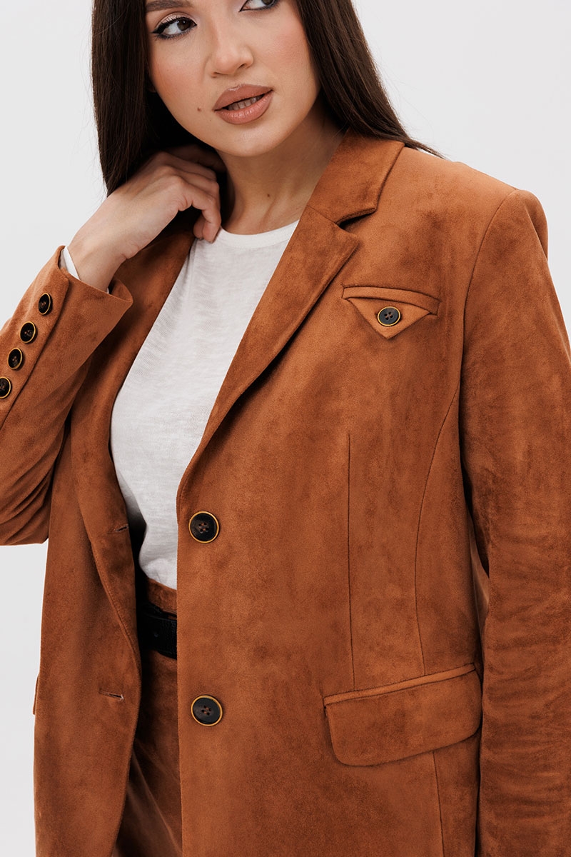Пиджак классического покроя, слегка упрямленный, с центральной застежкой, английским воротником и втачным двухшовным рукавом со шлицей. Полочка с нагрудной вытачкой, с прорезным