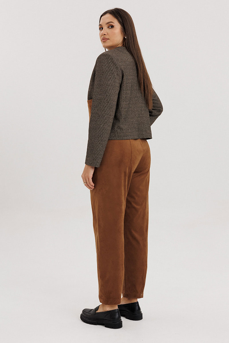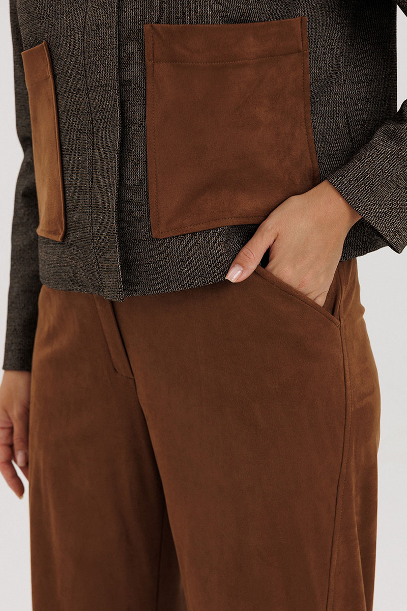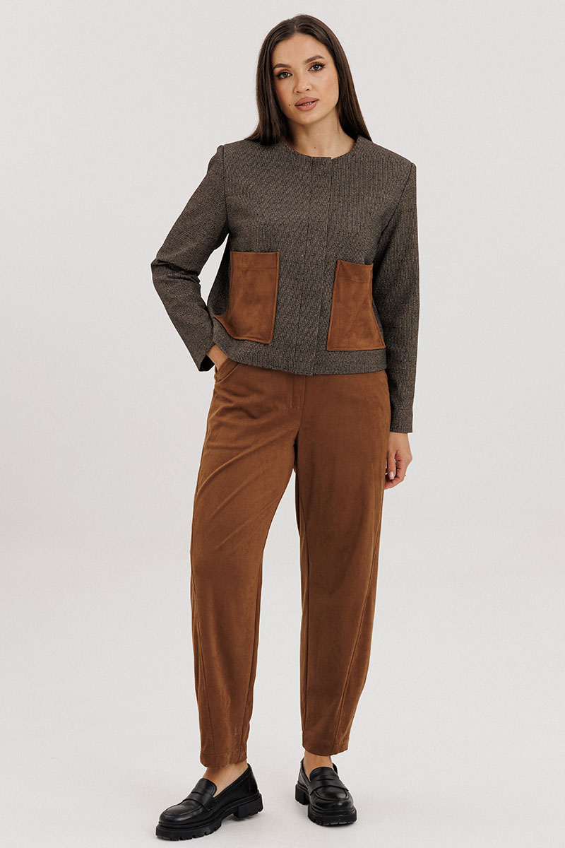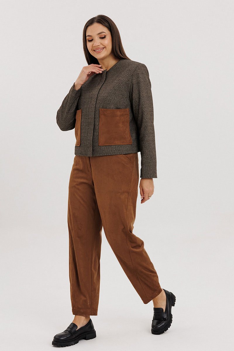 Брючный костюм в стиле casual из сочетания мягкого трикотажного вискозного полотна и благородной замши станет вашей универсальной находкой на каждый день.