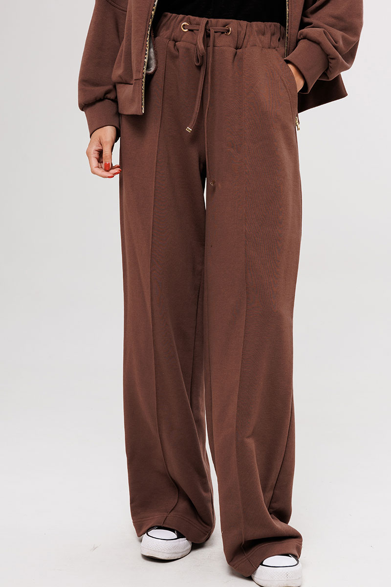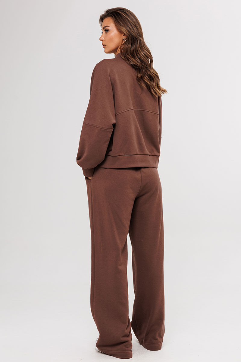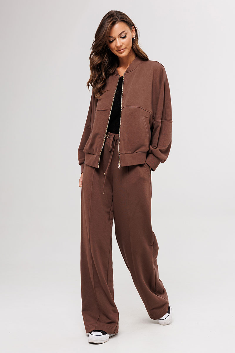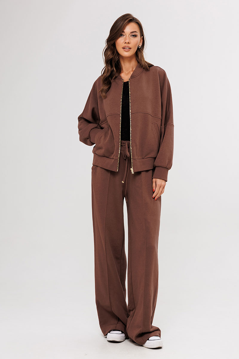 Спортивный костюм сегодня - это не только одежда для спорта гардероба любой современной девушки - он является ещё и элементом стиля.Спортивный костюм в шоколадном цвете будет уместен везде и всегда, несмотря на любые веяния моды.Костюм состоит из свободной лёгкой куртки и прямых брюк.