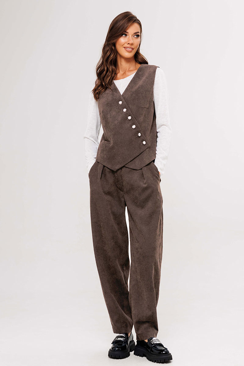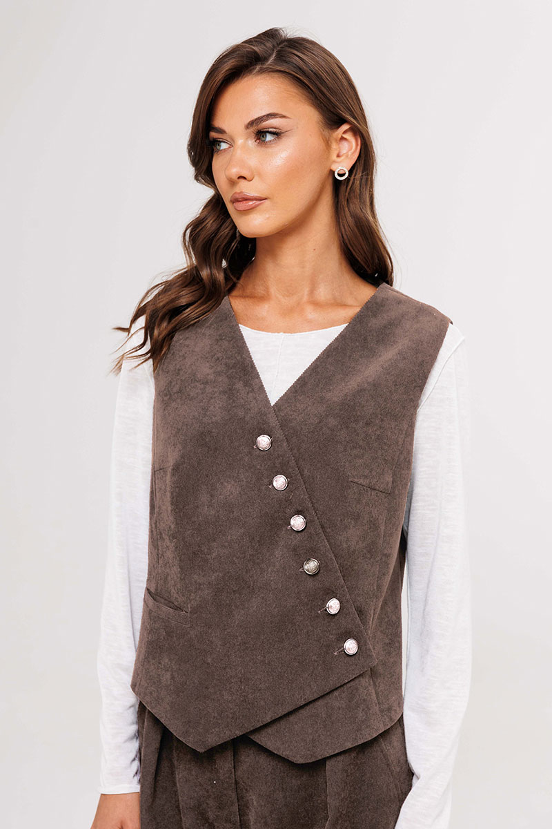 Жилет полуприлегающего силуэта с асимметричной застёжкой, фигурной линией низа и регулирующийся кулисе по спинке. Полочки с отрезным бочком и нагрудными вытачками, спинки - с центральным швом, отрезным бочком и регулирующийся кулисой с фиксаторами.