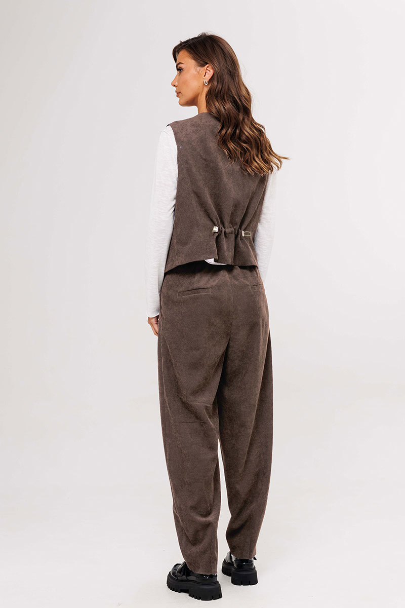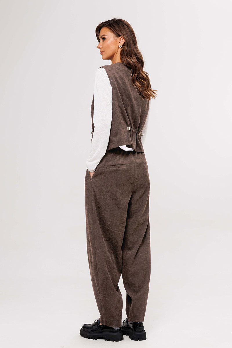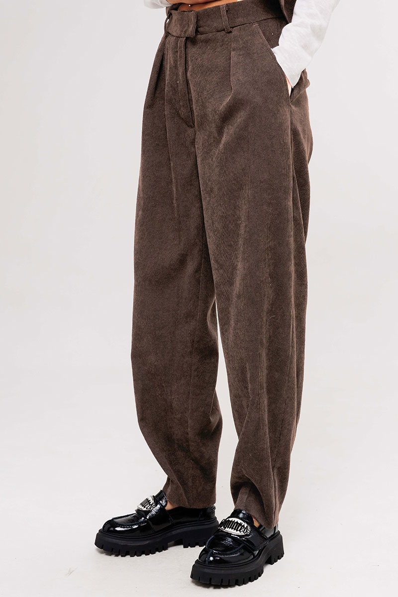 Брюки "баррел" на притачном поясе со шлёвками (эластичном в области спинки), с наклонными карманами , мягкими складками защипами по верху брюк и вытачками по низу.