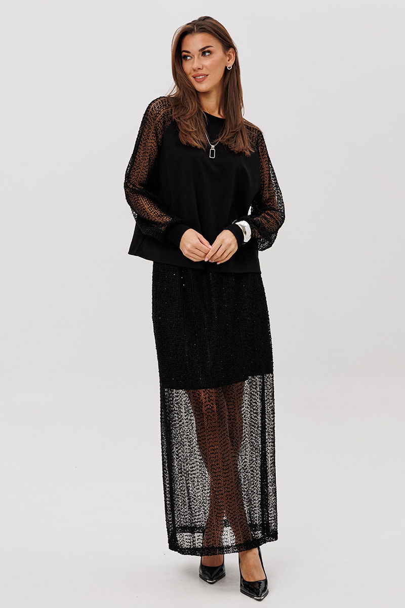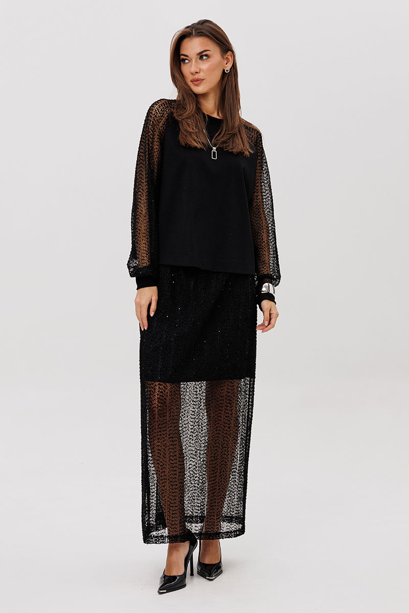 Юбка макси гармонично поддерживает дизайн: плотная внутренняя часть обеспечивает комфорт и уверенность, а длинная прозрачная нижняя вставка из мерцающей сетки добавляет загадочности и женственности. Комплект смотрится нарядно, но остаётся практичным — идеален как для вечерних выходов, так и для особых событий, где хочется выглядеть эффектно, но без излишнего пафоса.