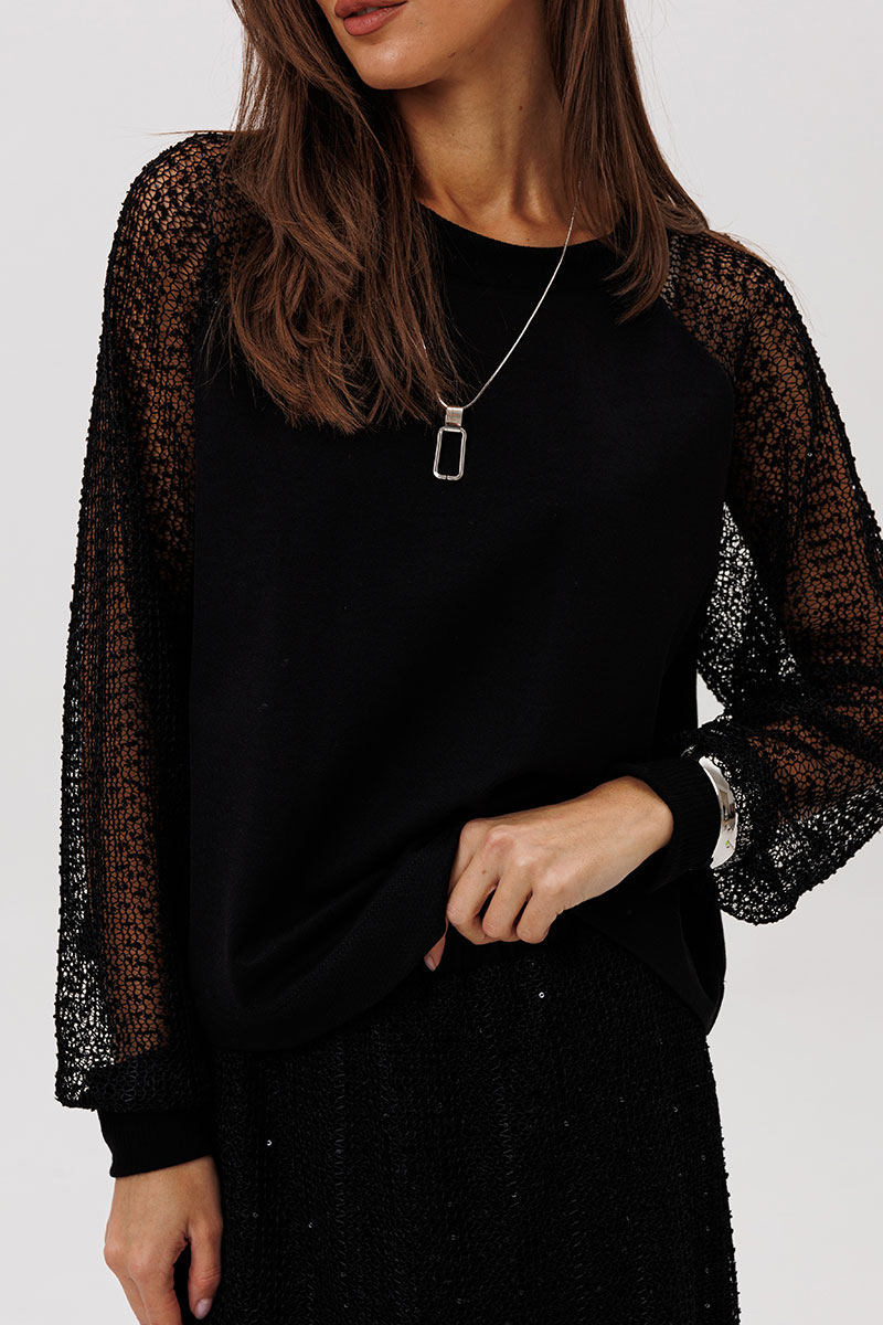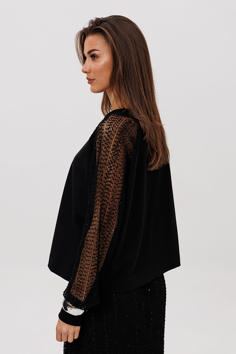 Элегантный юбочный комплект, созданный для тех, кто ценит сочетание комфорта и эффектного стиля. Верх выполнен из мягкого, комфортного вискозного полотна с нейлоном, приятного к телу и отлично удерживающего форму. Лёгкая воздушность образу придают полупрозрачные мерцающие рукава, выполненные из сетки с вкраплением микропайетки — они создают утончённую игру света при движении.