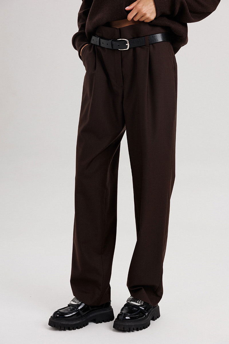 Брюки классические, прямые, на отрезном поясе со шлевками, эластичном в области спинки. Передние половинки брюк с талиевыми вытачками и наклонными боковыми карманами.
