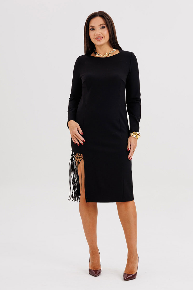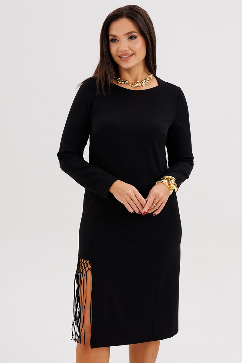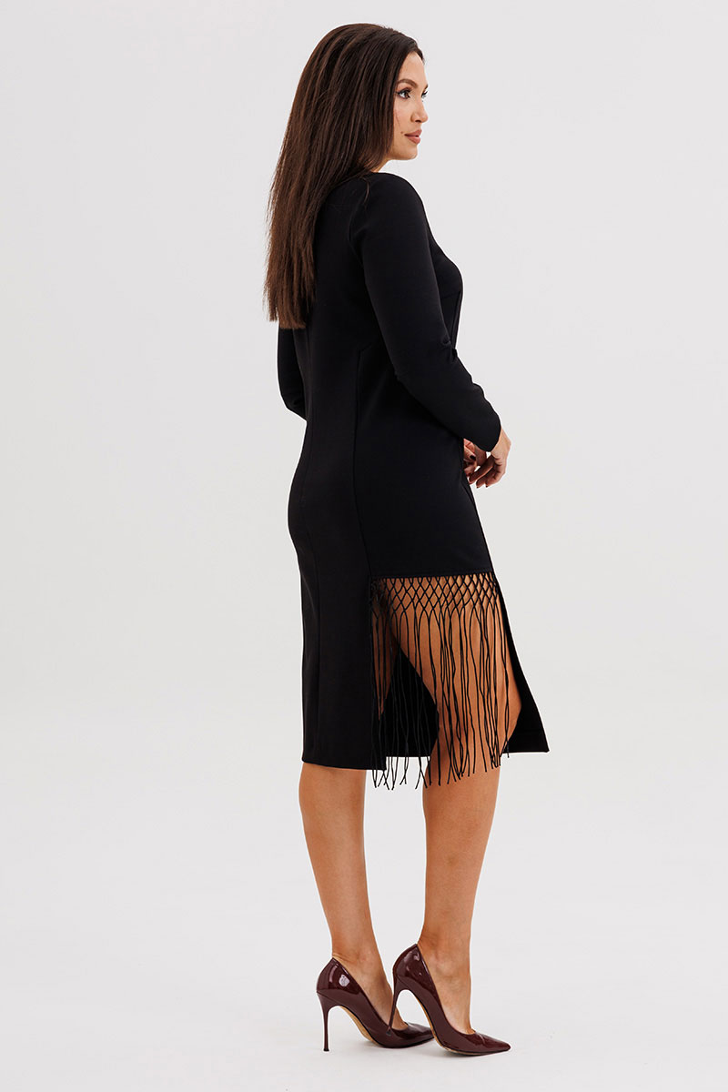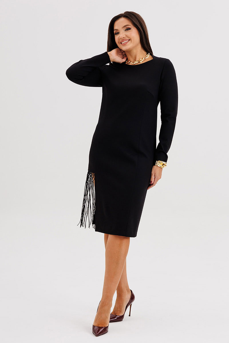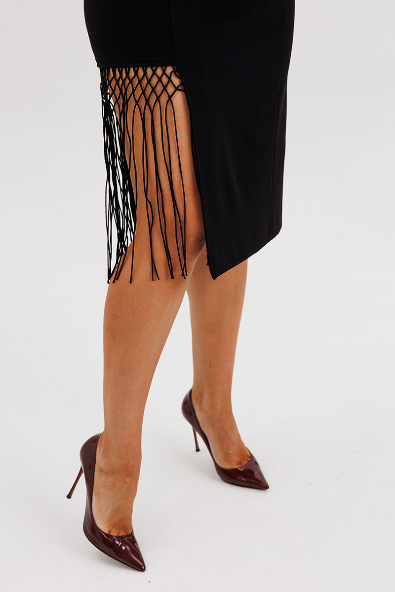 Главный акцент — асимметричный разрез, декорированный сеткой с бахромой ручной работы, придаёт модели индивидуальность и лёгкий артистичный характер.