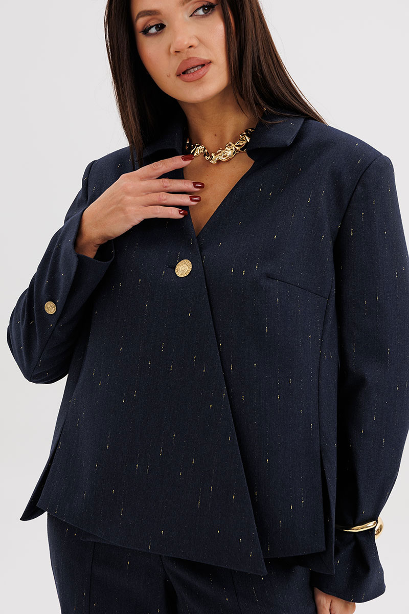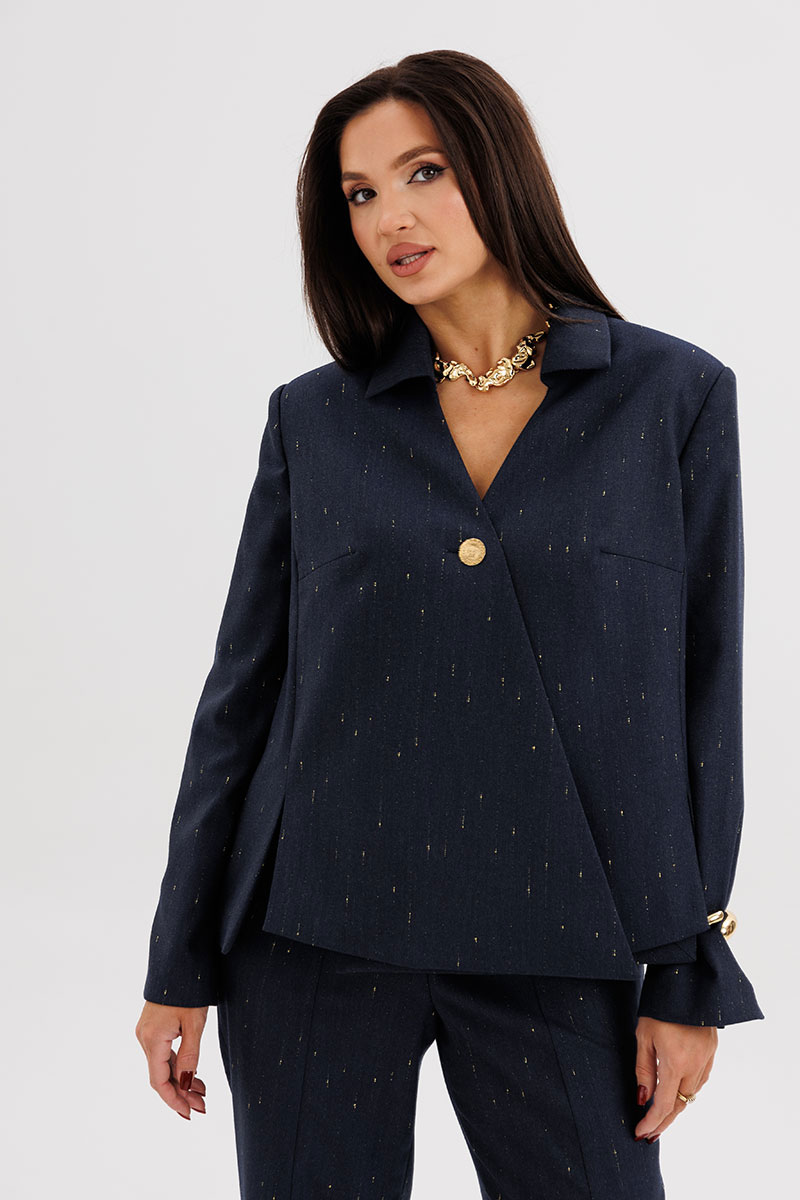 Жакет прямого силуэта выполнен с необычной асимметричной линией борта, которая добавляет образу индивидуальности и лёгкий дизайнерский акцент. Застёжка на крупные декоративные