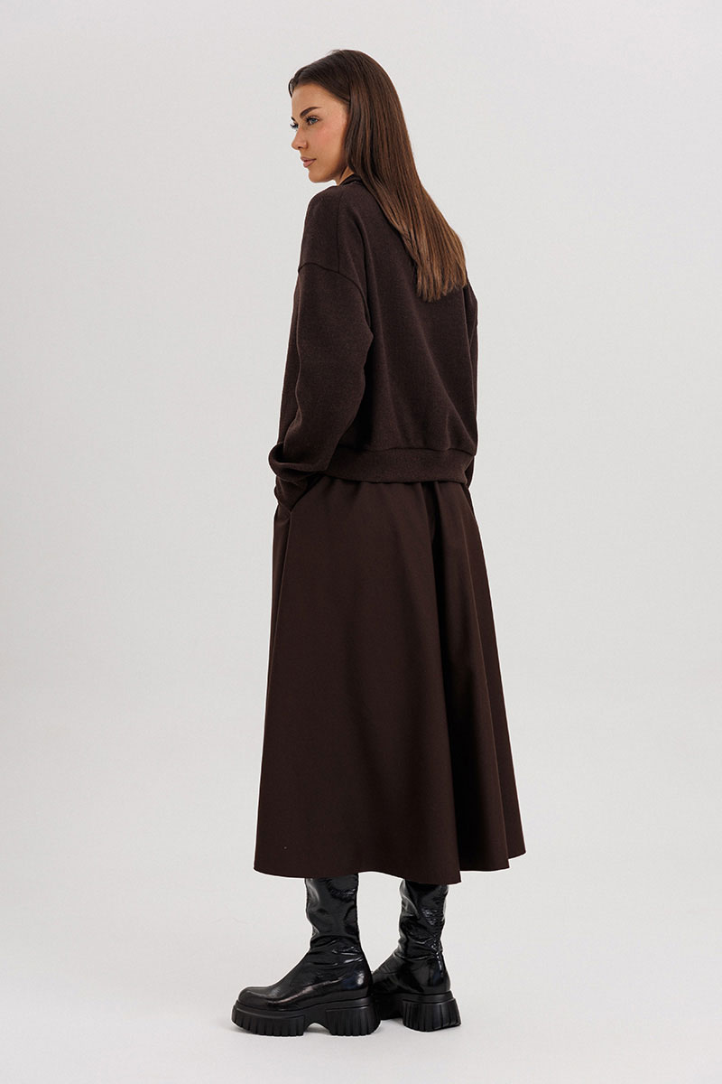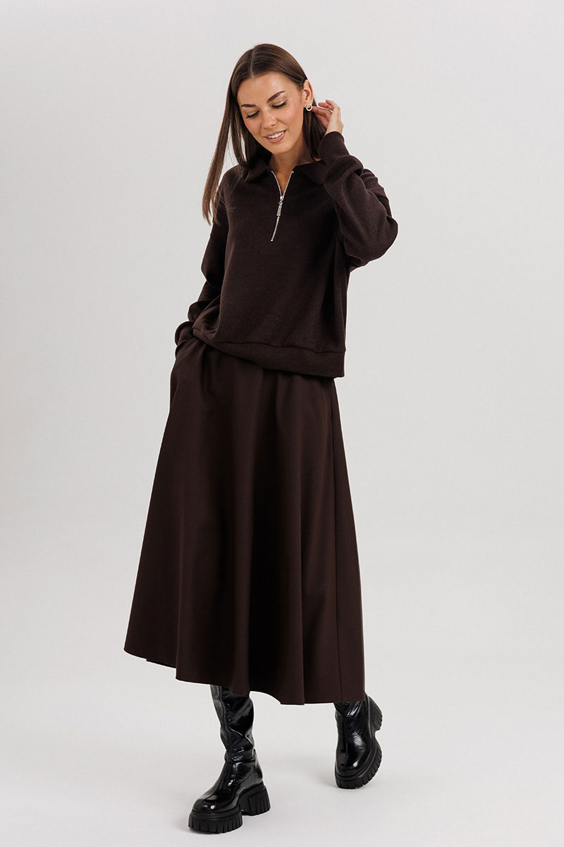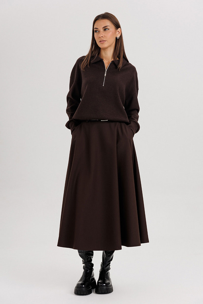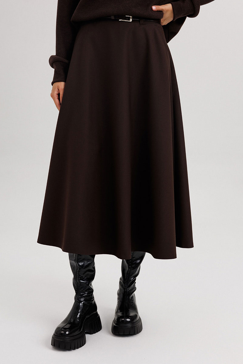 Юбка коническая, длины миди на притачном поясе, частично эластичном в области спинки. По боковым швам - наклонные карманы, застёжка по центру заднего полотнища на тесьму-молнию и петлю пуговицу. Поя в комплект не вхолит.