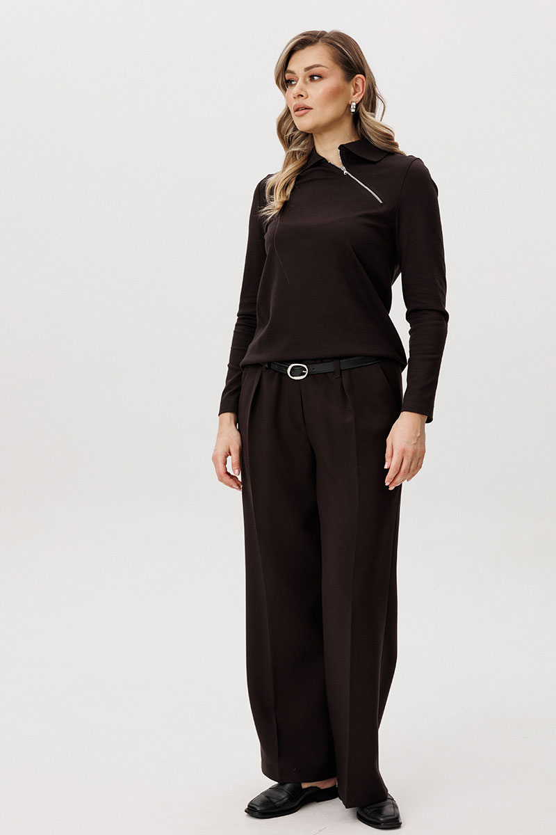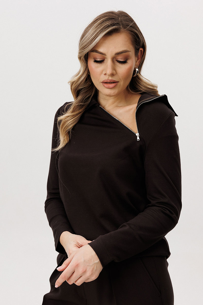 Трикотажный лонгслив прилегающего силуэта подчёркивает фигуру и обеспечивает комфорт в течение всего дня. Акцентная застёжка-молния у горловины добавляет образу современный характер и позволяет варьировать степень открытости.
