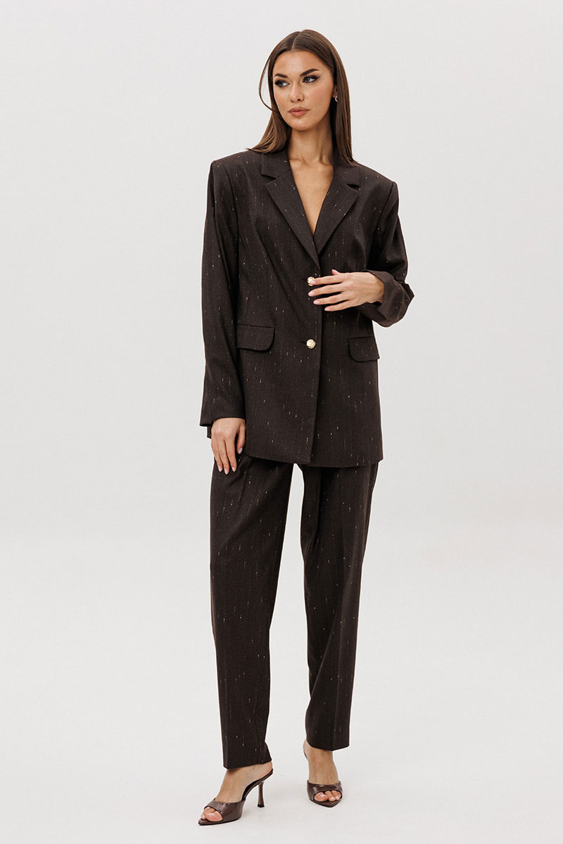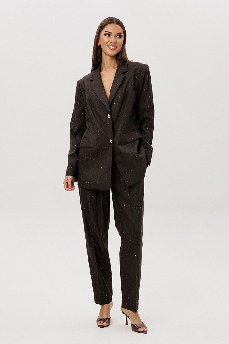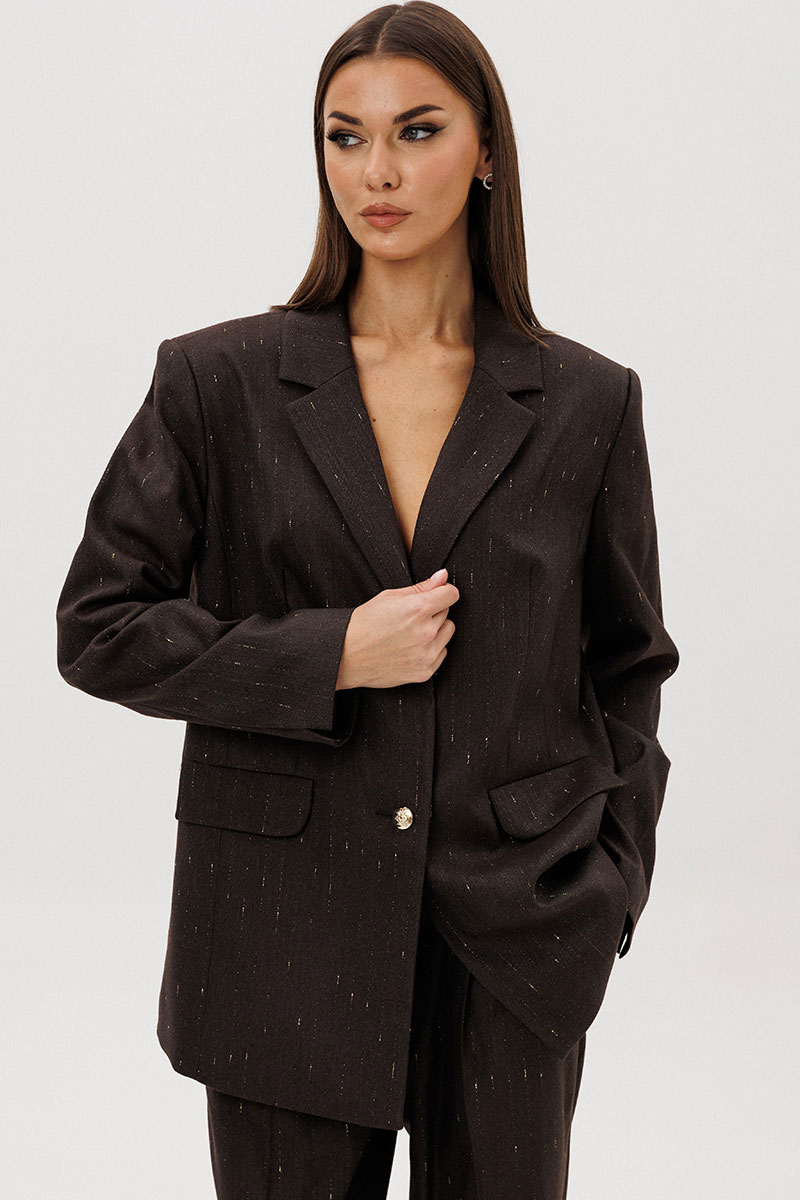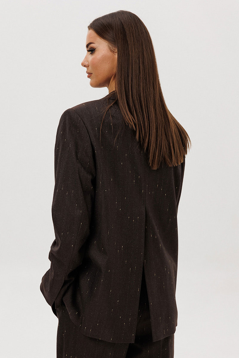 Жакет свободного расширенного силуэта, втачного покроя с центральной застёжкой и классическим английским воротником. Полочка с отрезным бочком, нагрудной вытачкой и прорезным карманом