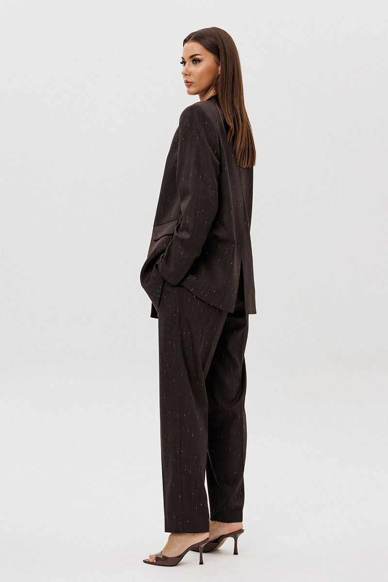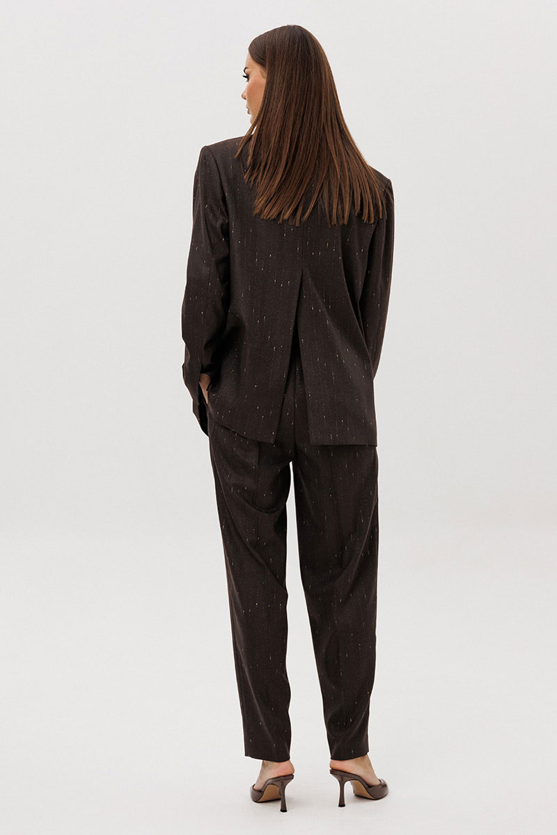 складками-защипами и наклонными боковыми карманами. Задние половинки брюк с вытачками и прорезными карманами с листочками.