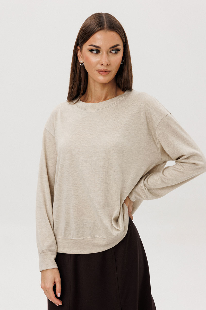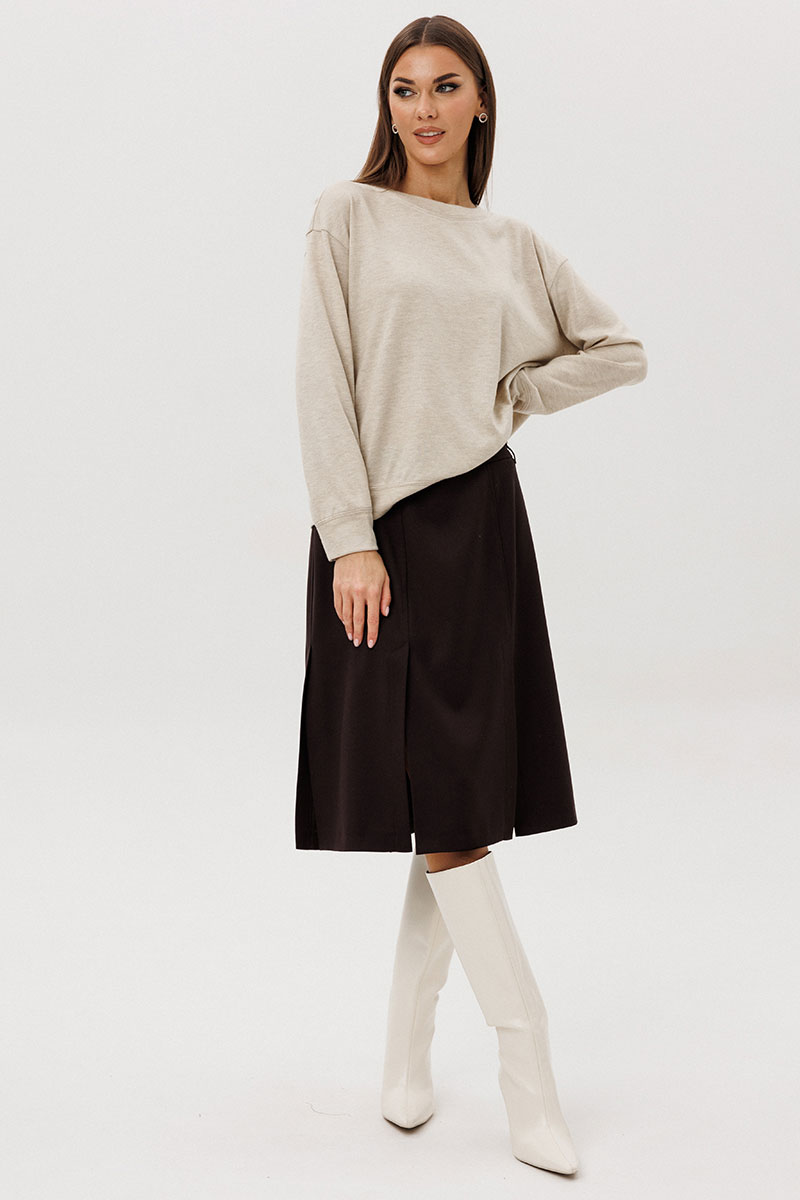 К ней идеально подходит трикотажный джемпер из мягкого смешанного полотна с шерстью — комфортный, тёплый и благородно текстурный. Он создаёт аккуратный, дорогой объём и мягко обнимает фигуру, обеспечивая комфорт в течение всего дня.