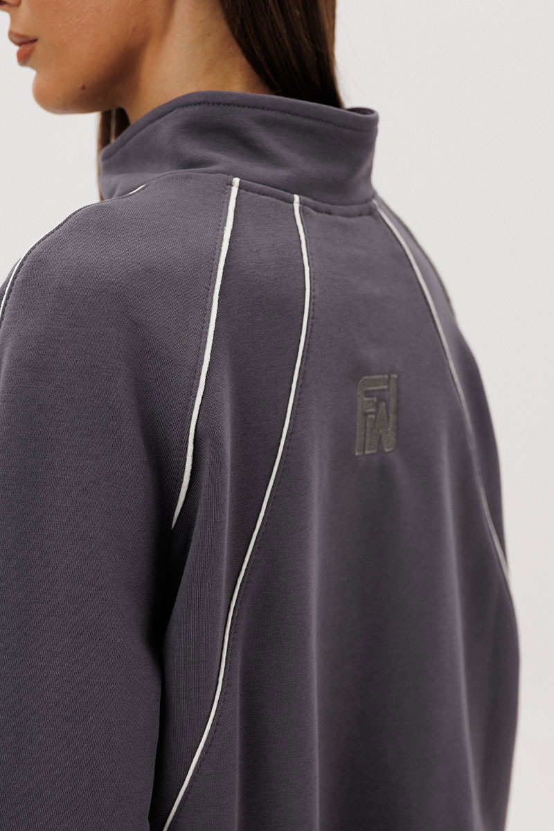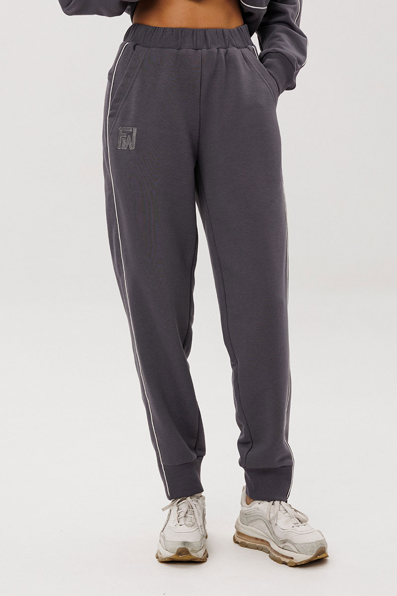 Джемпер покроя реглан с аккуратной стойкой и застёжкой-молнией украшен контрастными кантами, придающими образу динамику. Брюки со слегка зауженным силуэтом и манжетами по низу