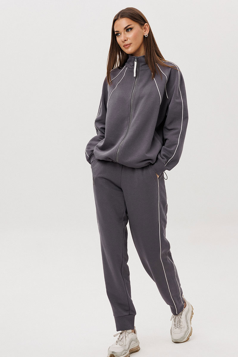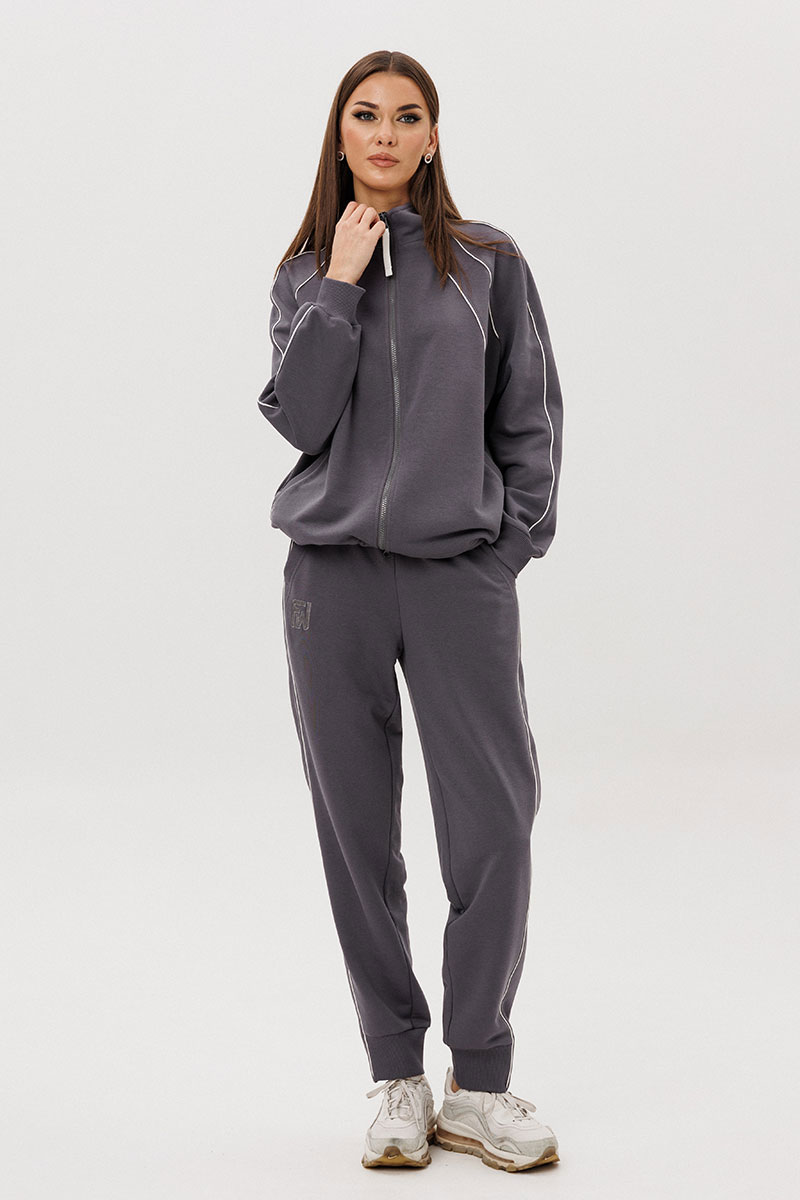 Современный костюм в стиле спорт-кэжуал — идеальный баланс комфорта и актуального дизайна. Модель выполнена из мягкого трикотажного полотна с добавлением хлопка, обеспечивающего