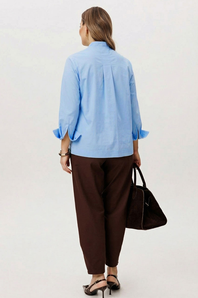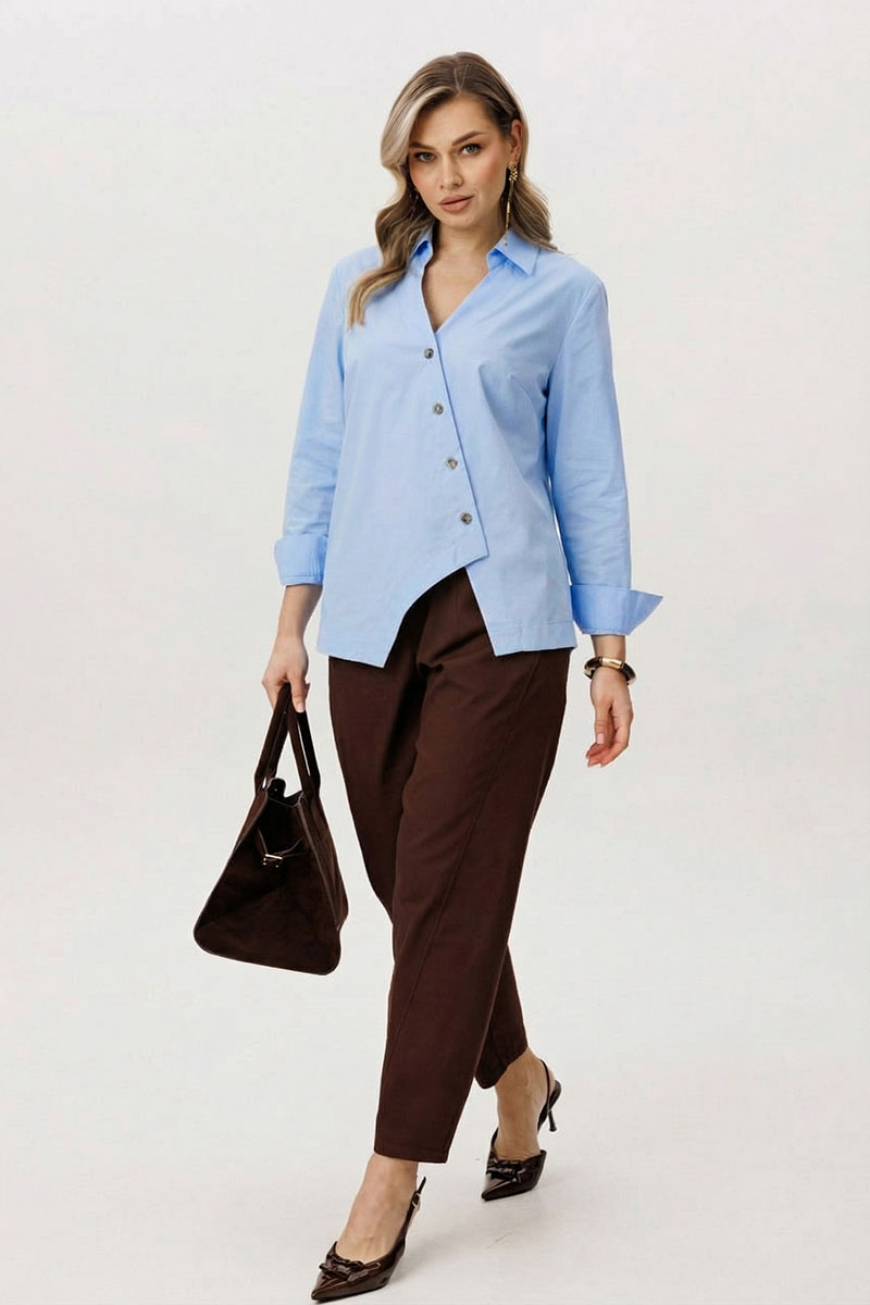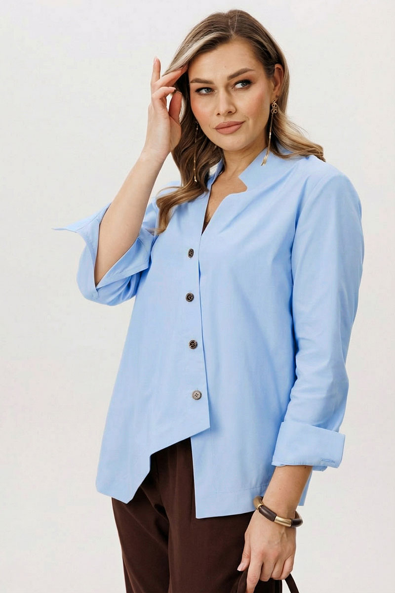 Рубашка выполнена из хлопкового полотна, что обеспечивает отличную воздухопроницаемость и лёгкость. Асимметричная линия низа и аккуратный ворот придают модели современный характер.