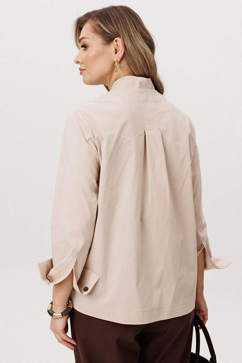 Рубашка выполнена из хлопкового полотна, что обеспечивает отличную воздухопроницаемость и лёгкость. Асимметричная линия низа и аккуратный ворот придают модели современный характер.