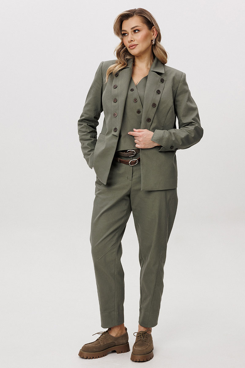 Жакет отличается двубортной косой застёжкой, которая легко трансформируется в отложной лацкан. Лацкан фиксируется к полочке с помощью пуговиц, что позволяет менять характер образа — от более строгого к расслабленному. Жилет с асимметричной застёжкой и неровной линией низа добавляет образу архитектурность и подчёркивает дизайнерский подход.