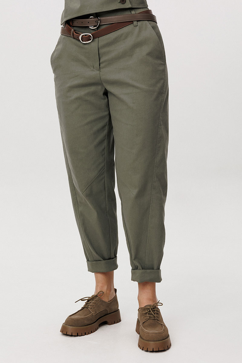 Брюки сложного кроя выполнены с цельнокроеным поясом спереди и притачным эластичным поясом на спинке, обеспечивающим комфортную посадку. Слегка зауженный книзу силуэт и наклонные боковые карманы формируют современную линию и визуально вытягивают фигуру.