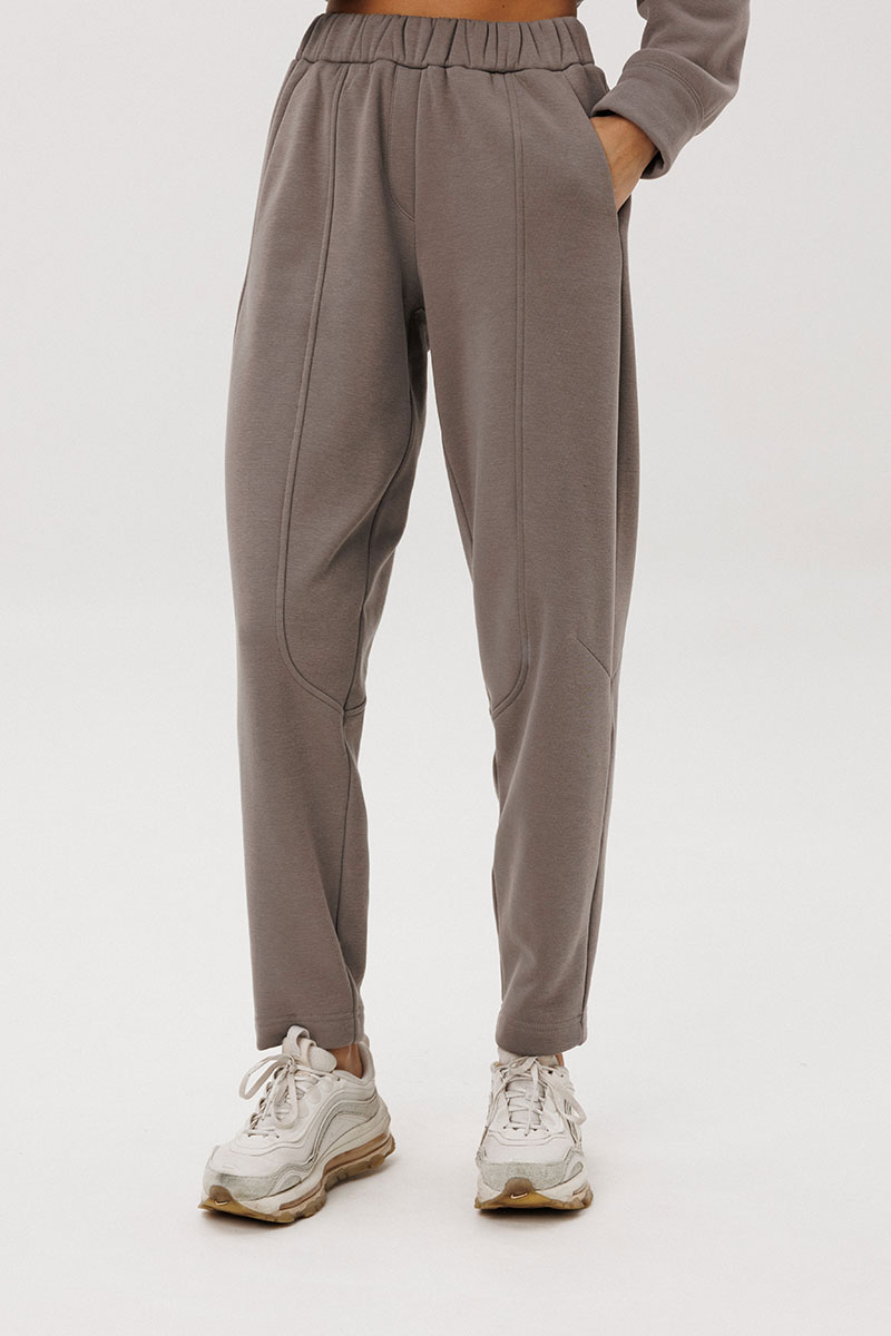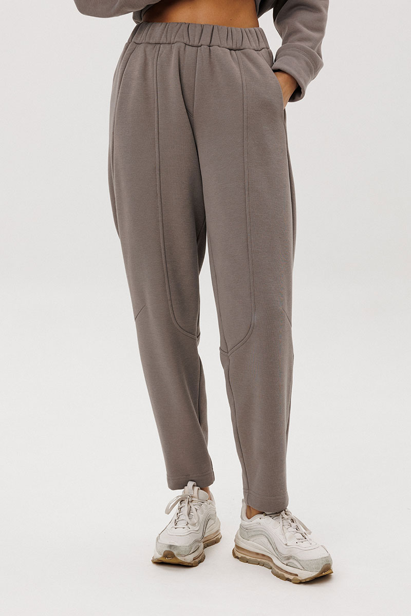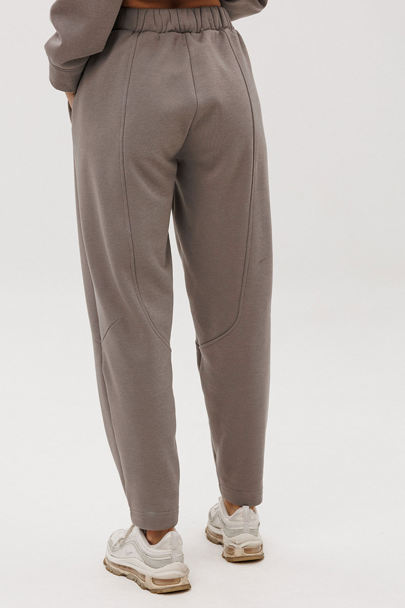 создаёт расслабленный силуэт, а брюки со слегка зауженным кроем и декоративными строчками добавляют образу актуальности.
