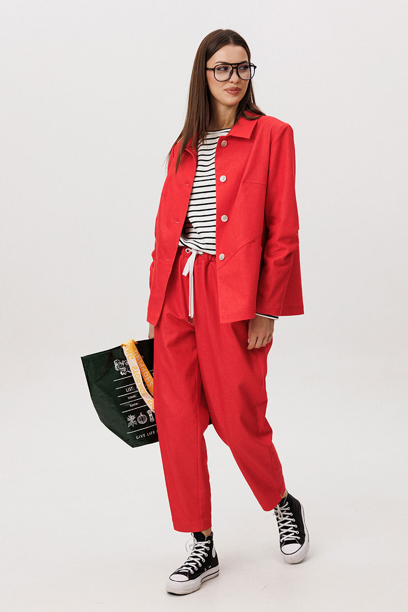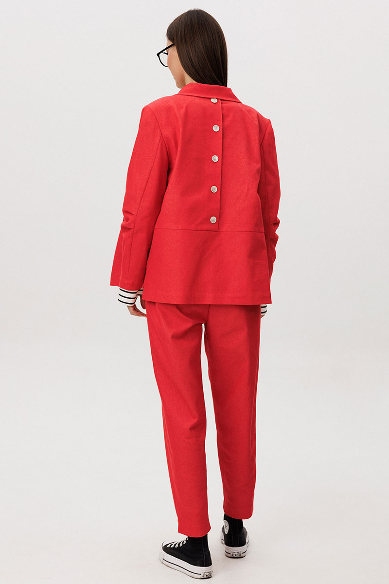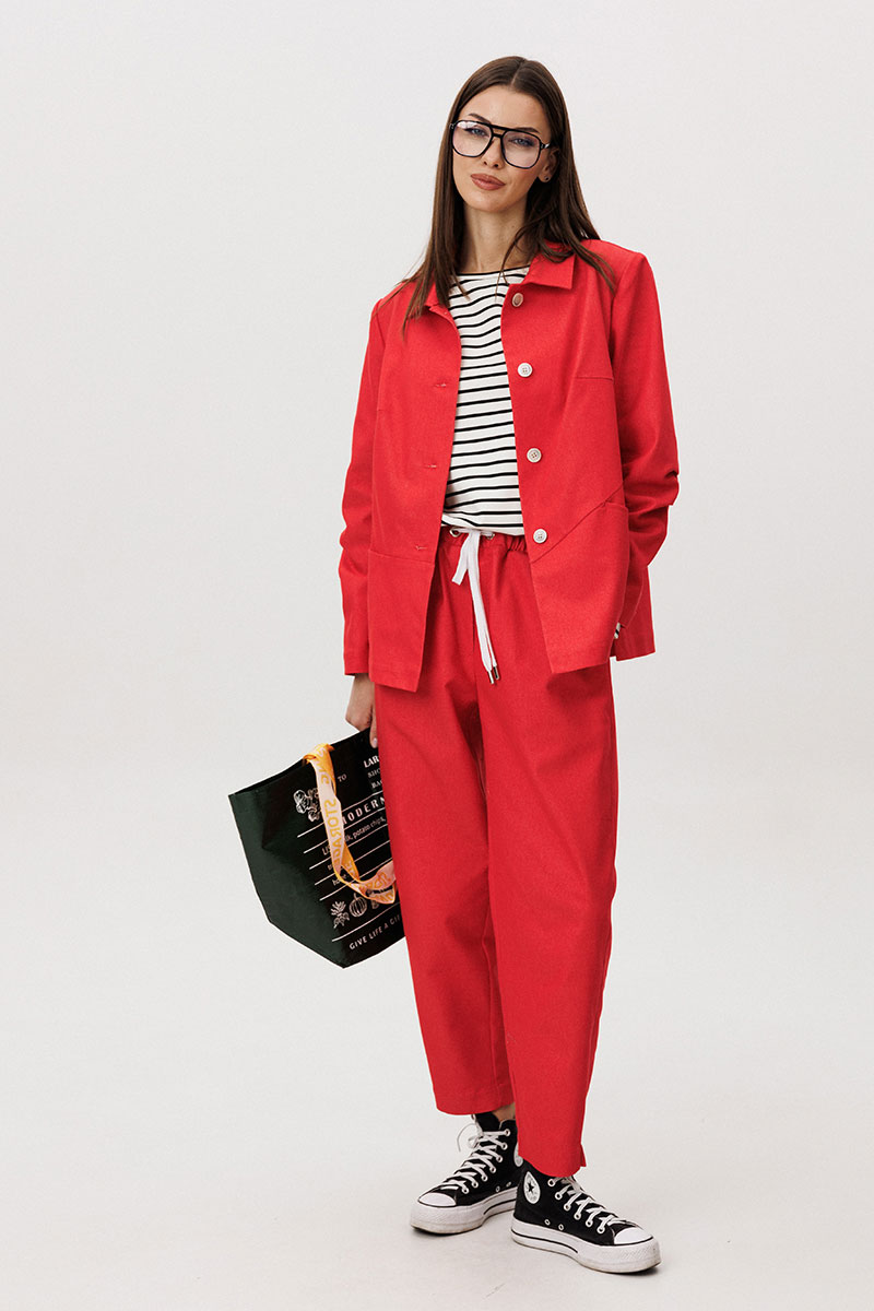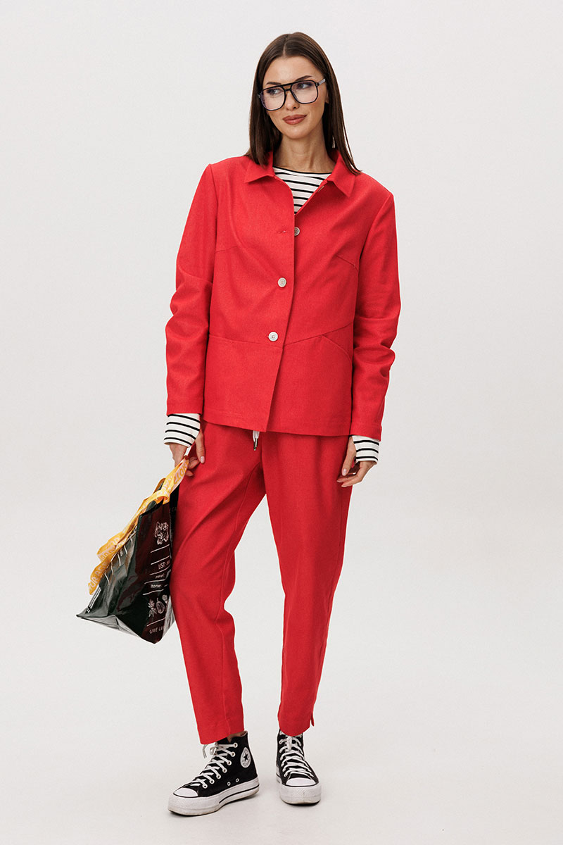 Жакет и брюки выполнены из плотного цветного денима, который придаёт образу структуру и выразительность, сохраняя при этом комфорт повседневной носки. Лаконичный крой подчёркивает современный городской характер модели.