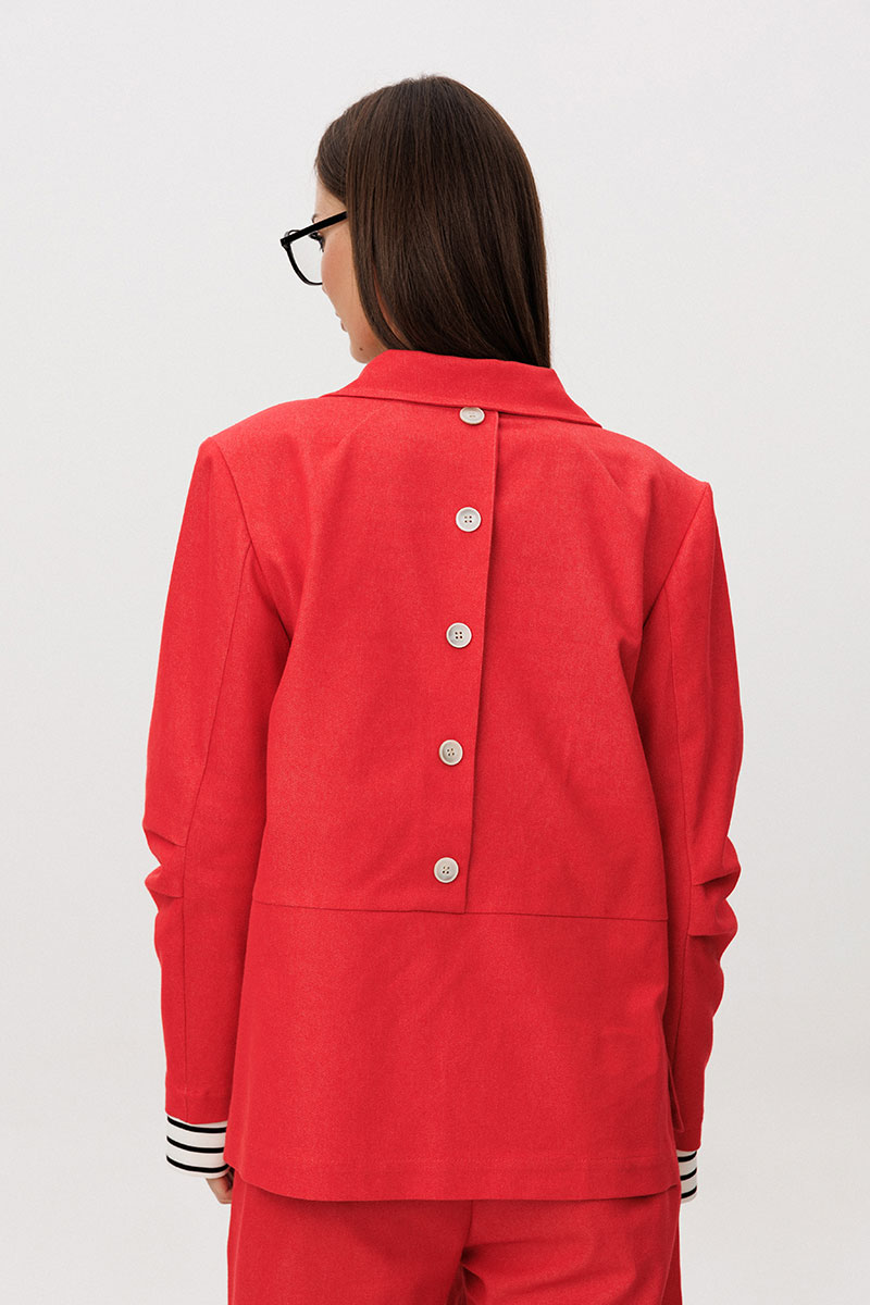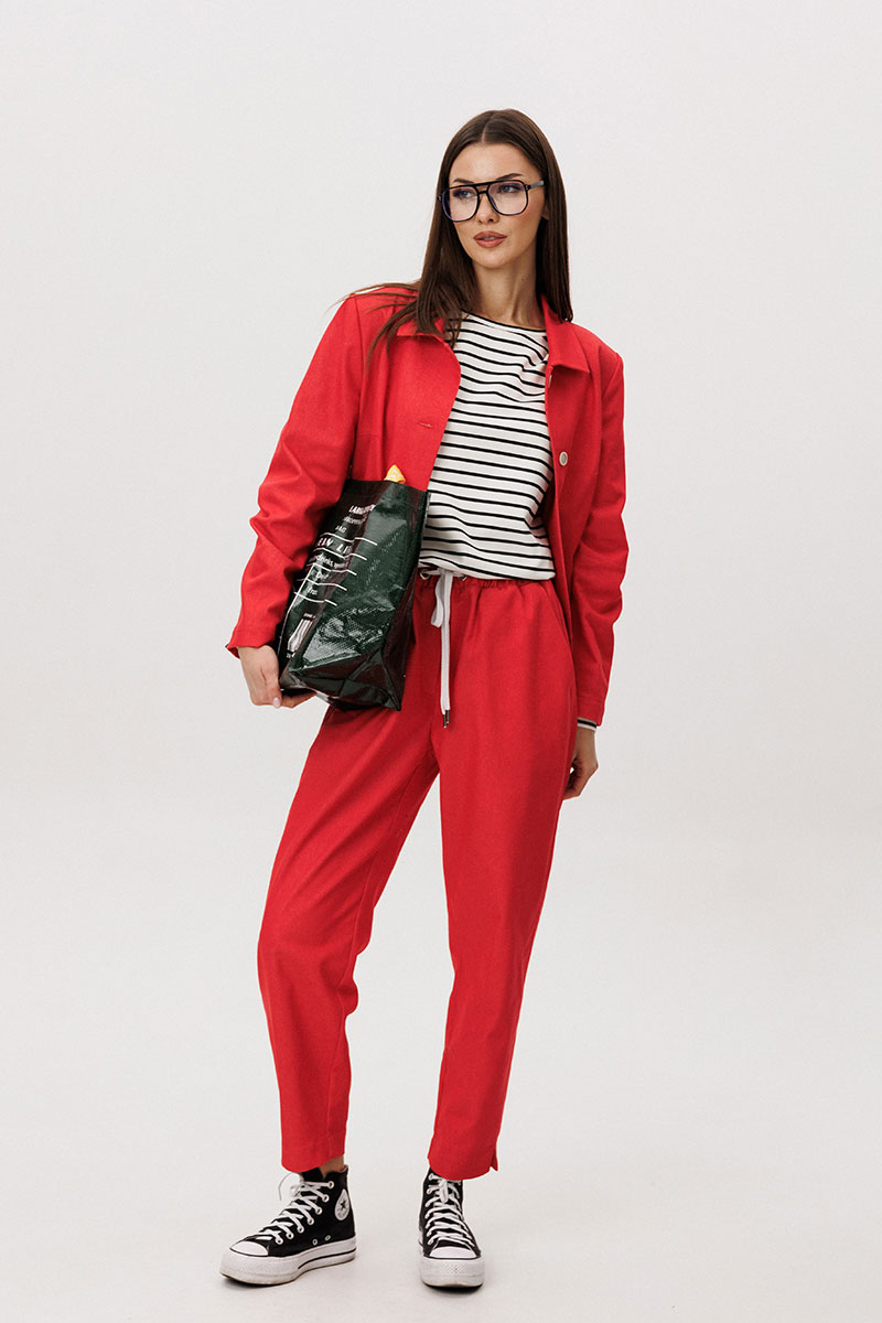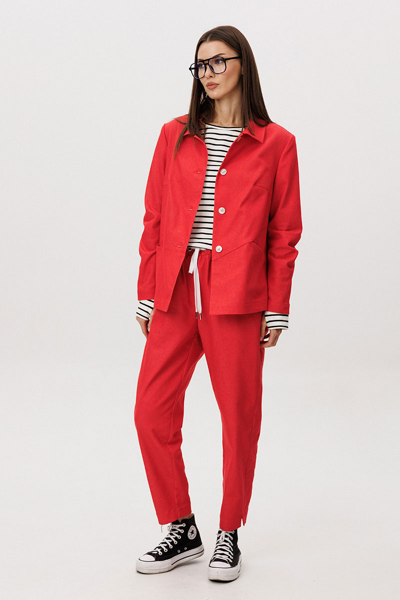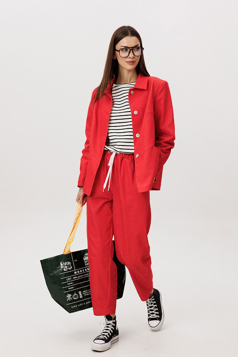 Жакет и брюки выполнены из плотного цветного денима, который придаёт образу структуру и выразительность, сохраняя при этом комфорт повседневной носки. Лаконичный крой подчёркивает современный городской характер модели.