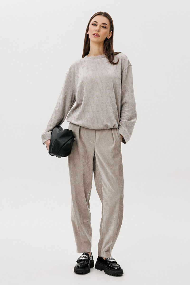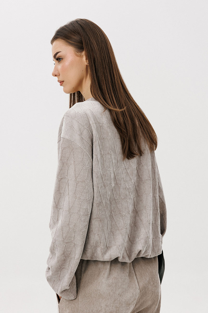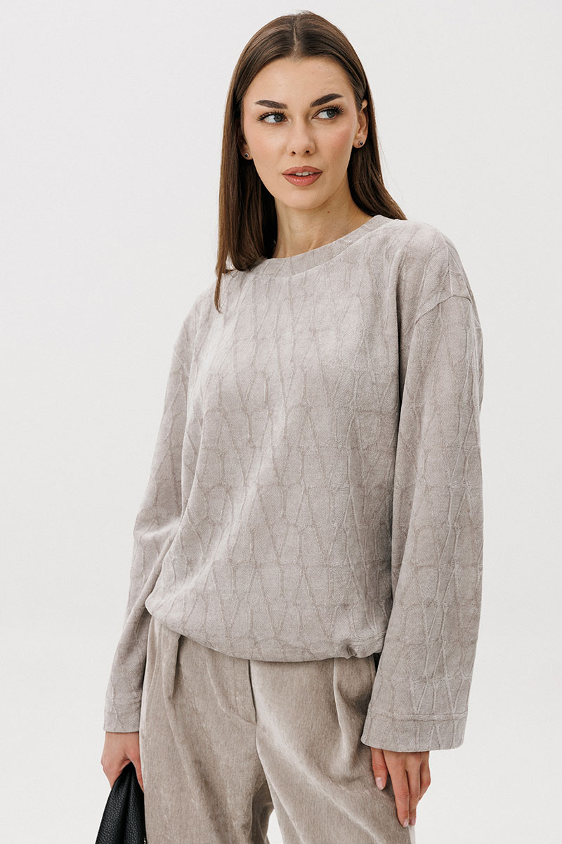 Свободный джемпер расширенного силуэта втачного покроя на заниженной линии плеча. Рукав расширенный в области оката. По низу джемпера шнур-резинка с фиксаторами.