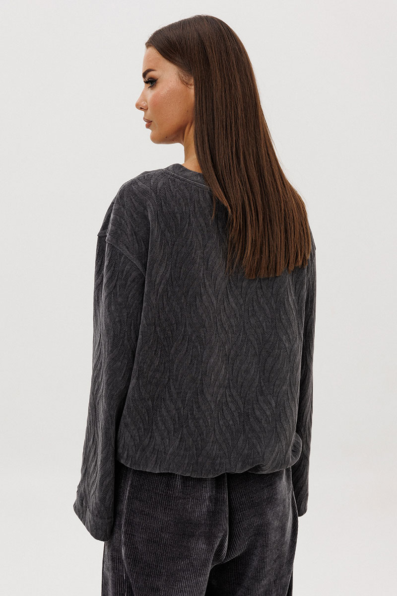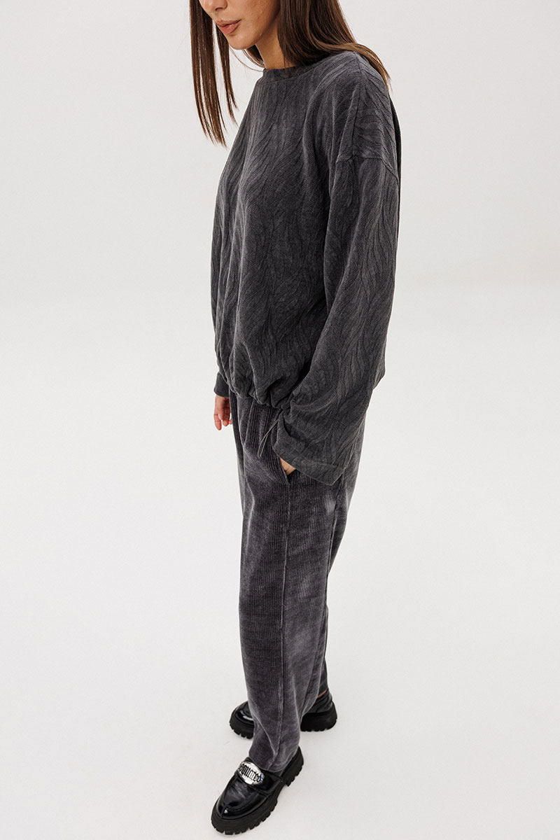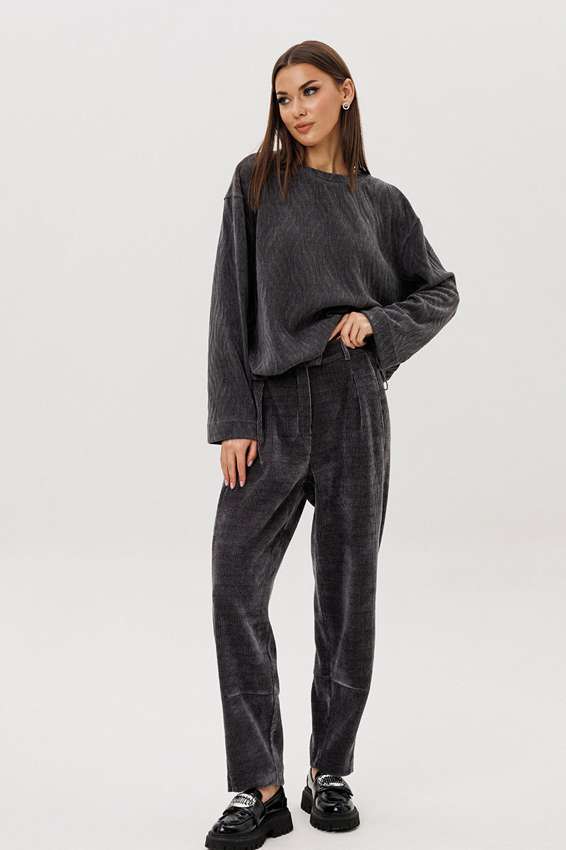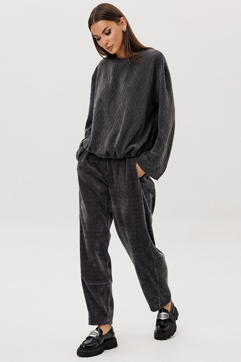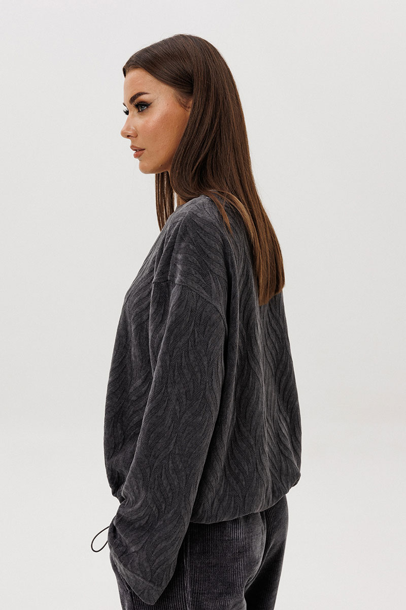 Свободный джемпер расширенного силуэта втачного покроя на заниженной линии плеча. Рукав расширенный в области оката. По низу джемпера шнур-резинка с фиксаторами.
