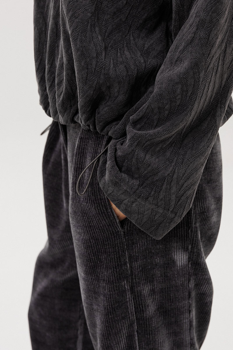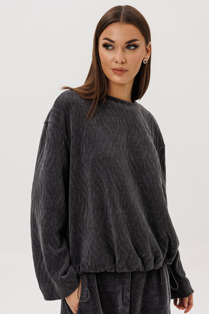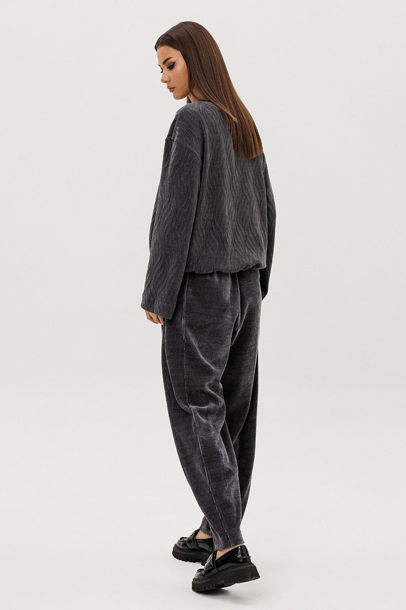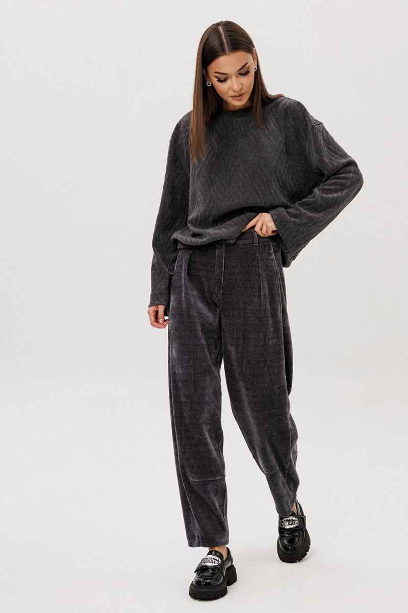 Свободный джемпер расширенного силуэта втачного покроя на заниженной линии плеча. Рукав расширенный в области оката. По низу джемпера шнур- резинка с фиксаторами. Брюки ""баррел"" на притачном поясе со шлёвками (эластичном в области спинки), с наклонными карманами , мягкими складками защипами по верху брюк.