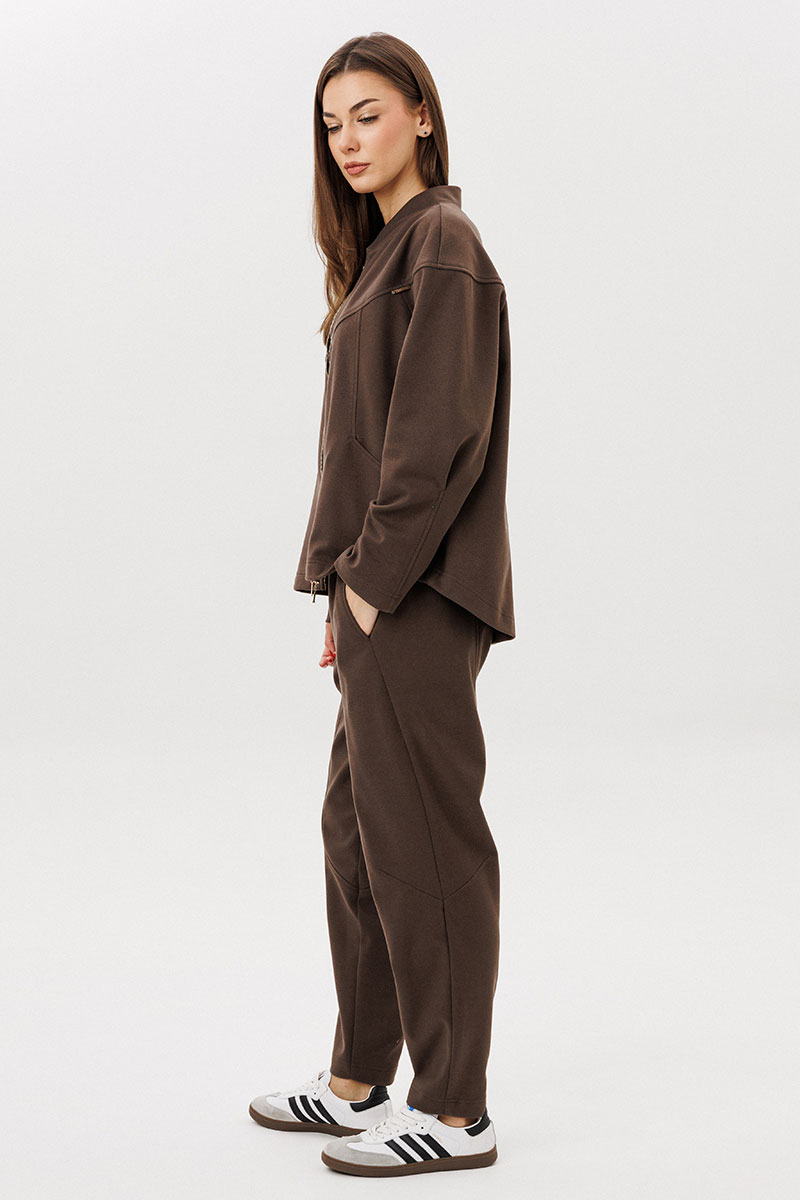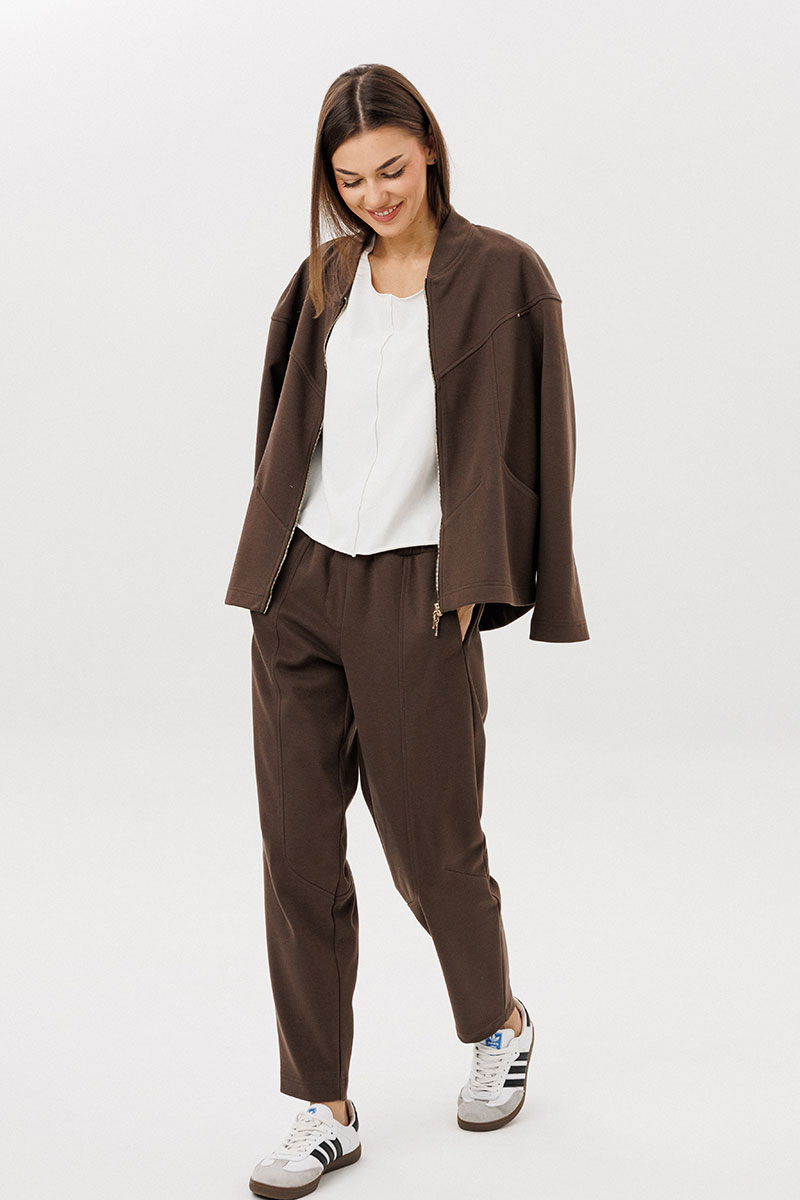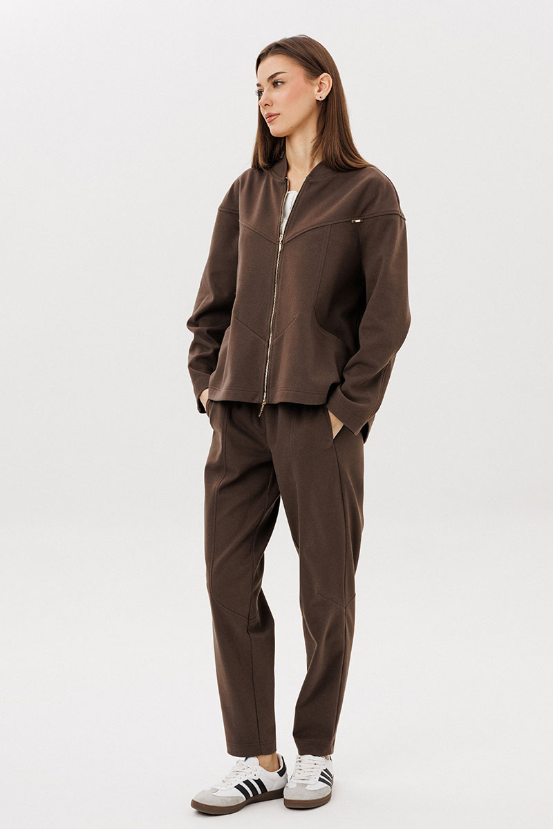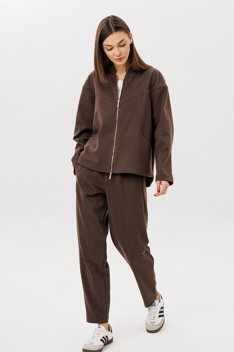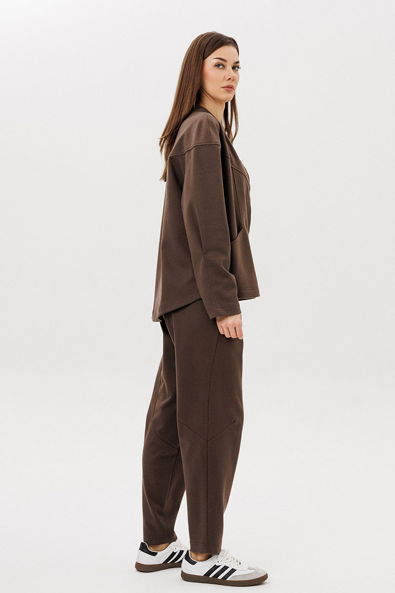 с отрезной кокеткой и фигурным рельефом, переходящим в карман. Спинка с отрезной кокеткой. Брюки свободные, на эластичном поясе в области спинки, с фигурными вертикальными рельефами