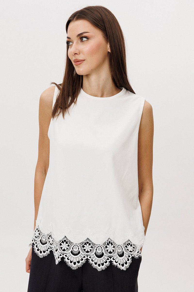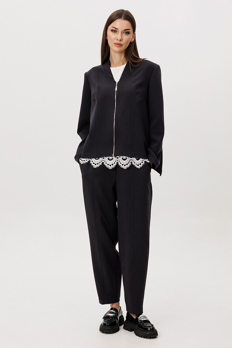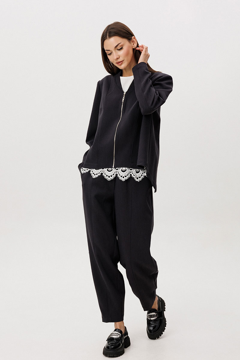 Расслабленные брюки-бананы с мягкой линией кроя обеспечивают комфорт и формируют актуальный силуэт с лёгким акцентом на талии. Хлопчатобумажный топ, декорированный изящным кружевом по нижнему краю, добавляет образу контрастную женственность и завершённость.