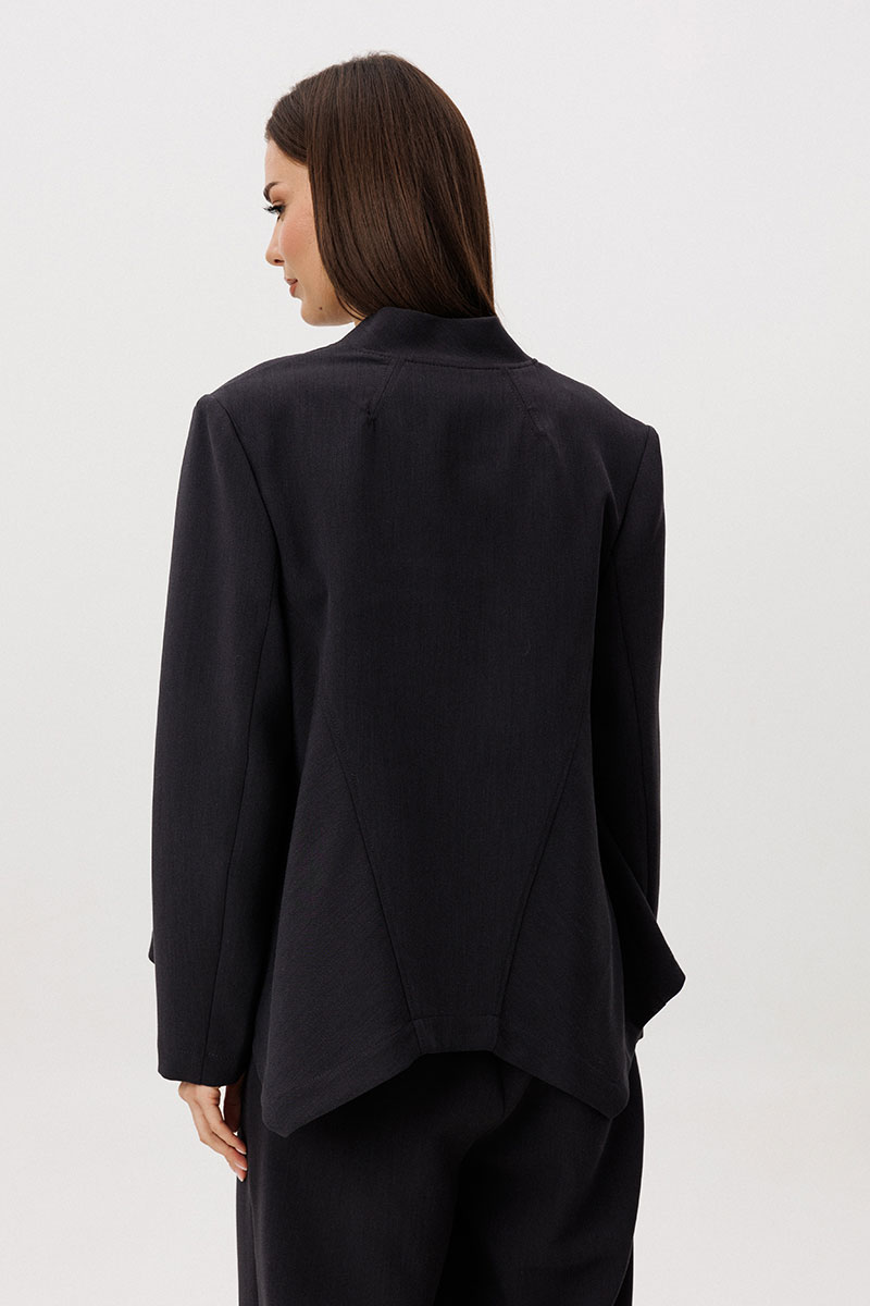 Жакет прямого силуэта выполнен со сложной архитектурной спинкой, создающей выразительный объём и подчёркивающей концептуальный характер модели. Застёжка на молнию добавляет образу графичность и современное звучание.
