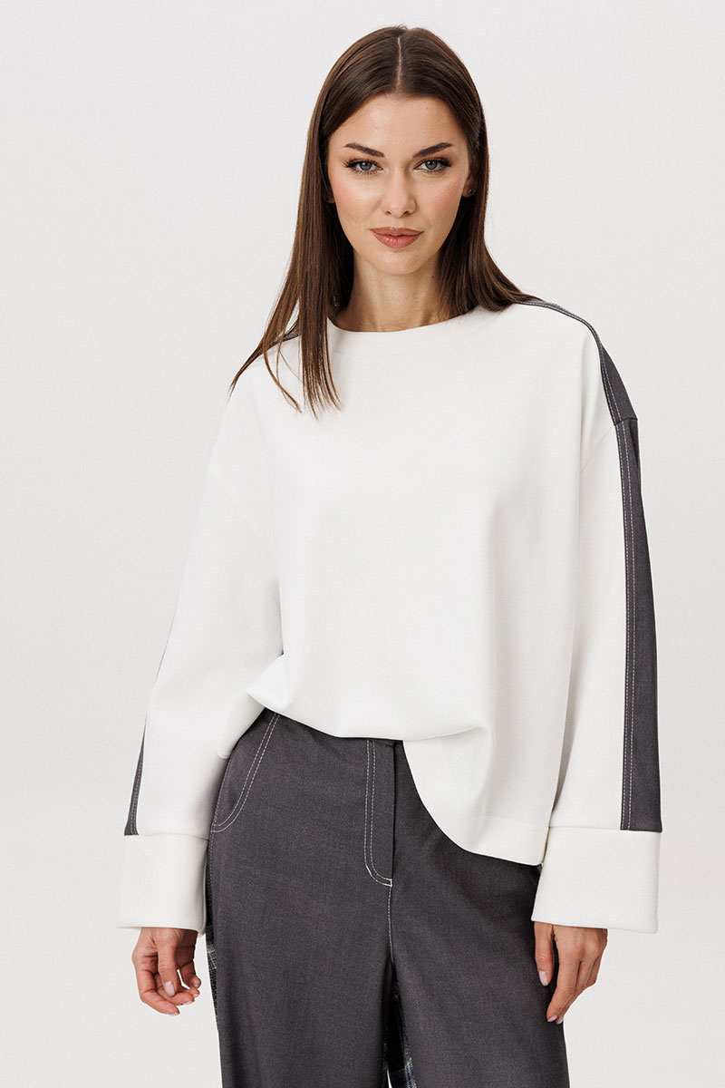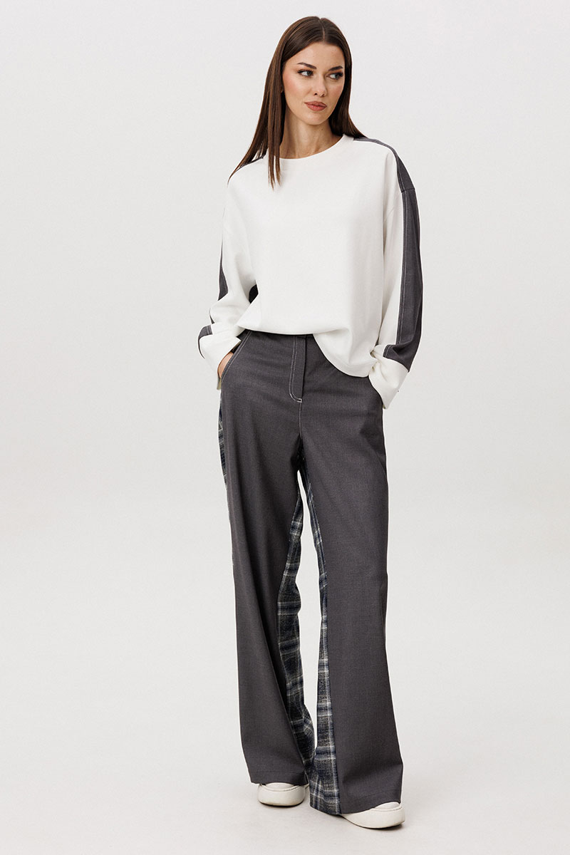 Свободный и стильный костюм для повседневного образа. Невероятный комбинированный свитшот, в котором полочка и часть рукава из мягкого вискозного трикотажа, а спинка из однотонного