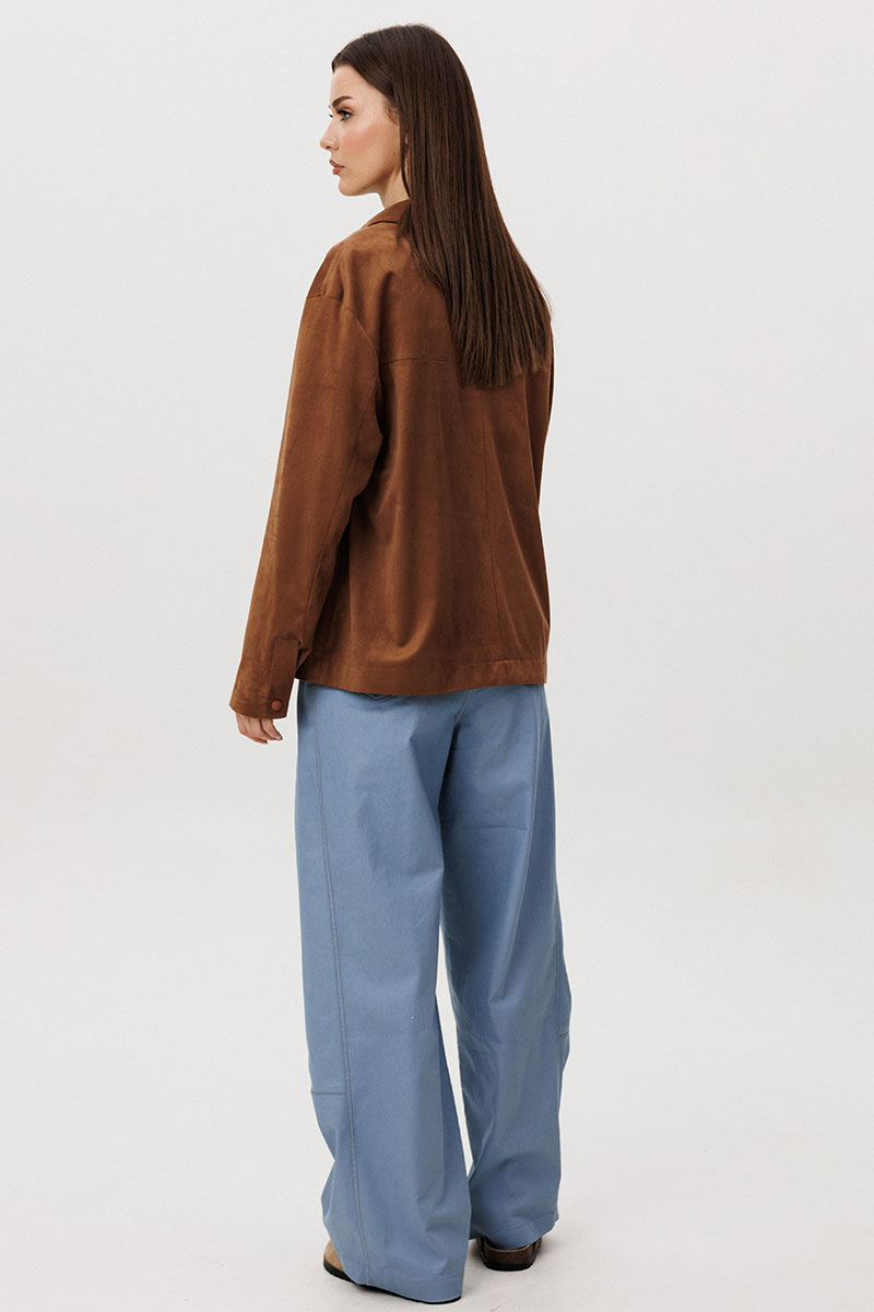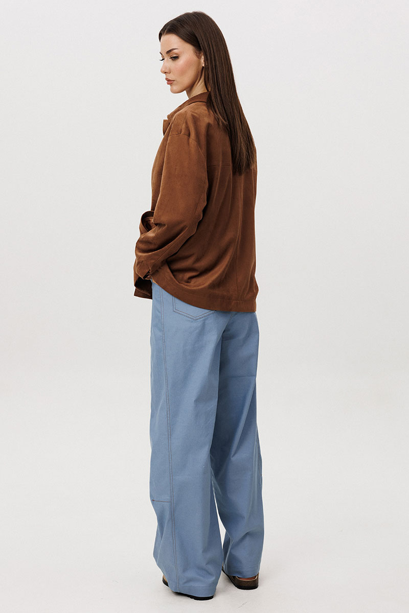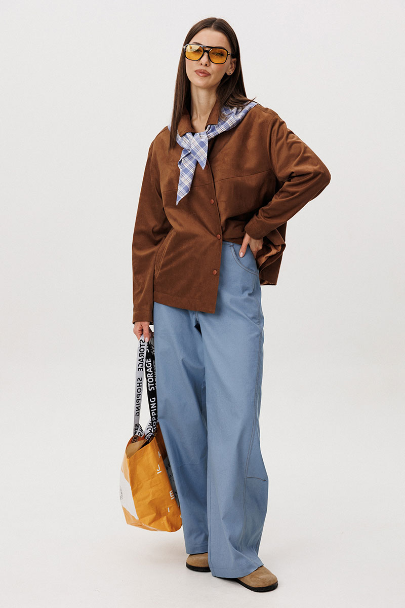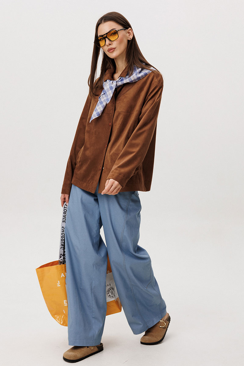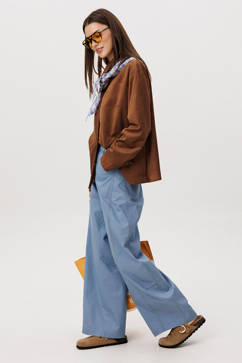 Стильный женский брючный костюм в стиле смарт-кэжуал сочетает комфорт и элегантность. Рубашка выполнена из замшевой ткани, брюки из джинсовой ткани тиффани. Идеальный выбор для