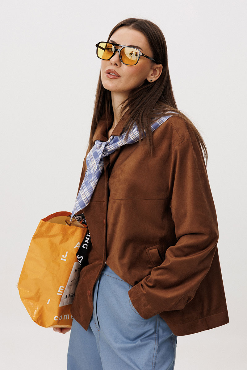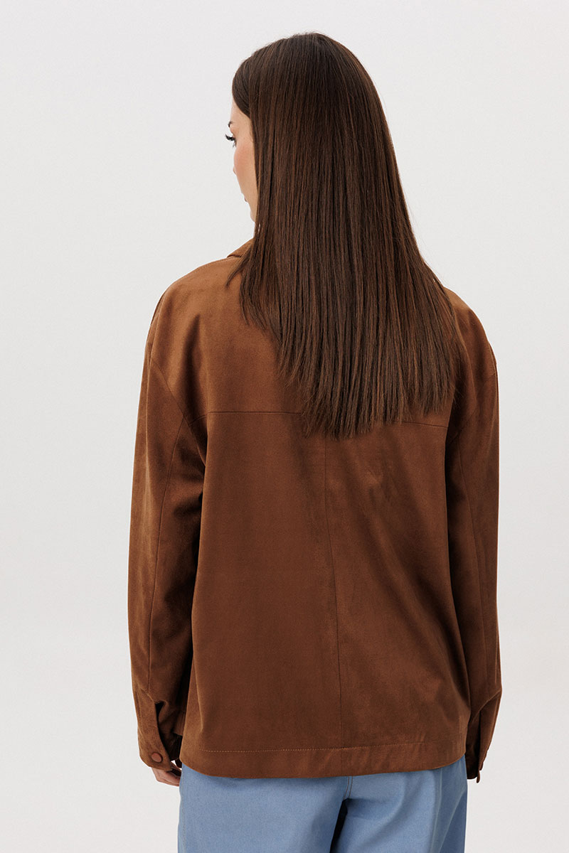 Рубашка: Свободный прямой силуэт, комфортная посадка. Материал под замшу в насыщенном коричневом оттенке. Классический отложной воротник. Застежка на кнопки. Практичные боковые