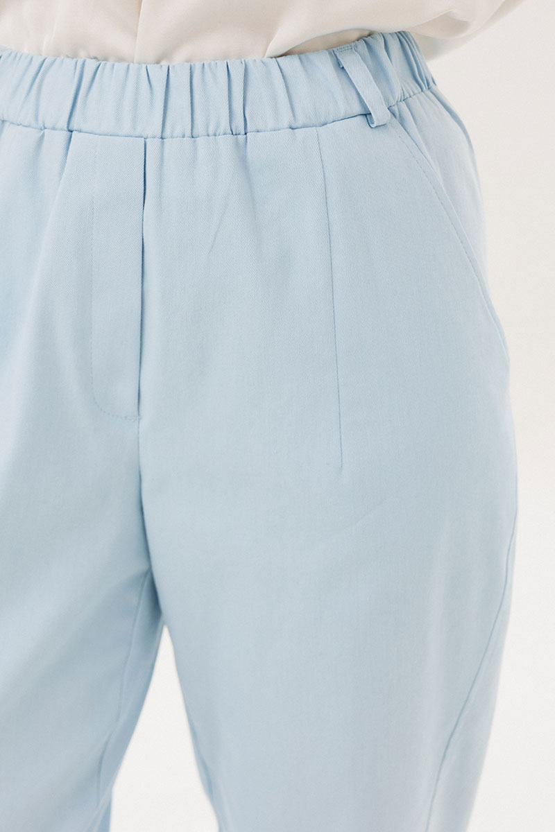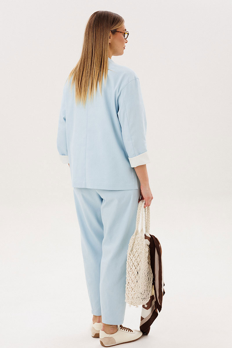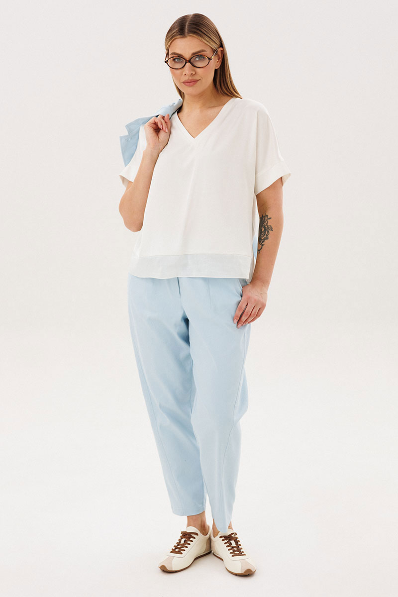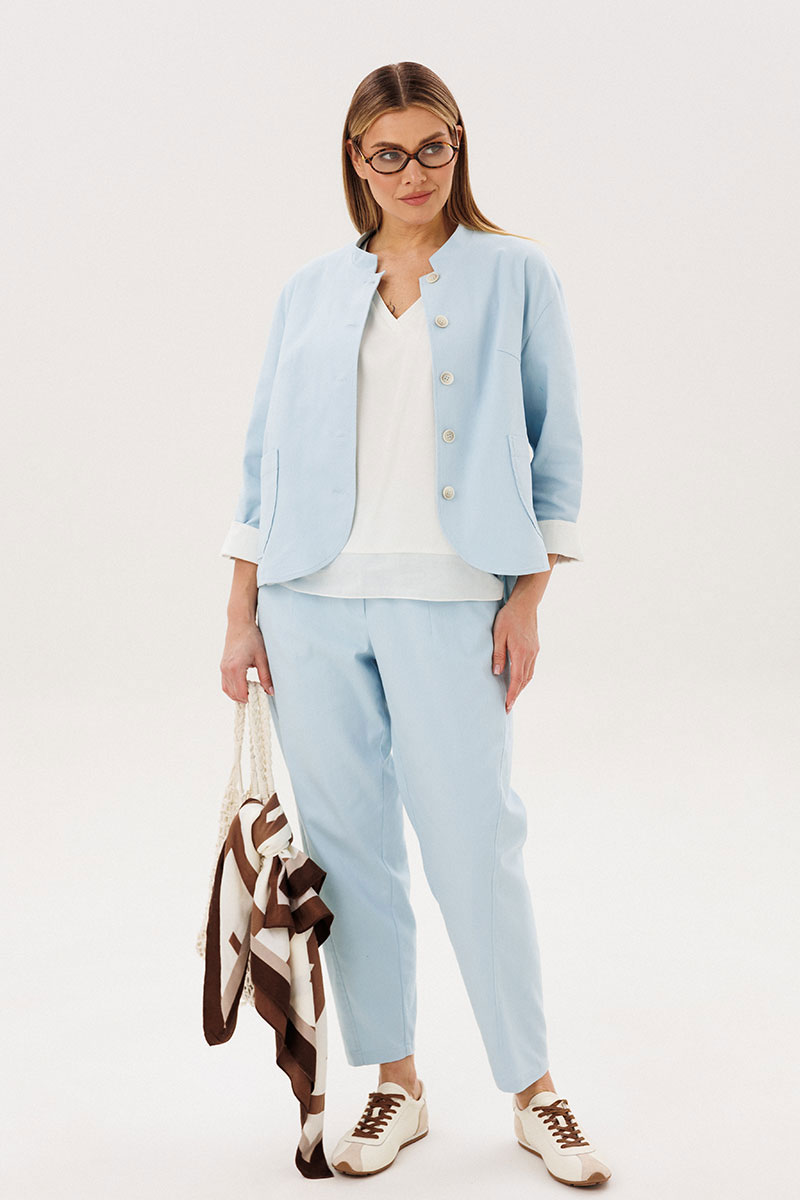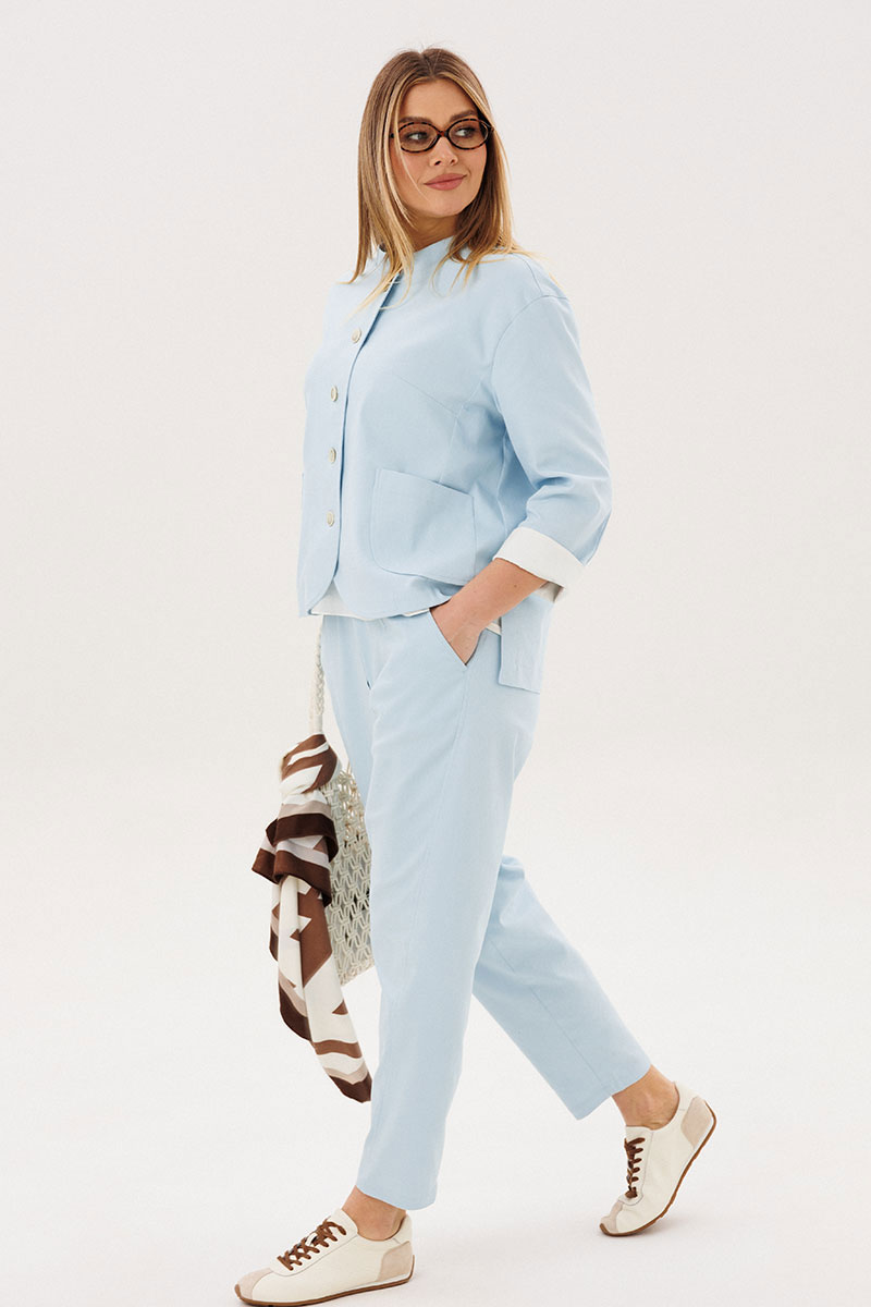 Стильный брючный комплект — идеальное сочетание комфорта и утончённой элегантности. Модель выполнена в нежном голубом оттенке и дополнена трендовой атласной блузой, создавая актуальный и гармоничный образ на каждый день.