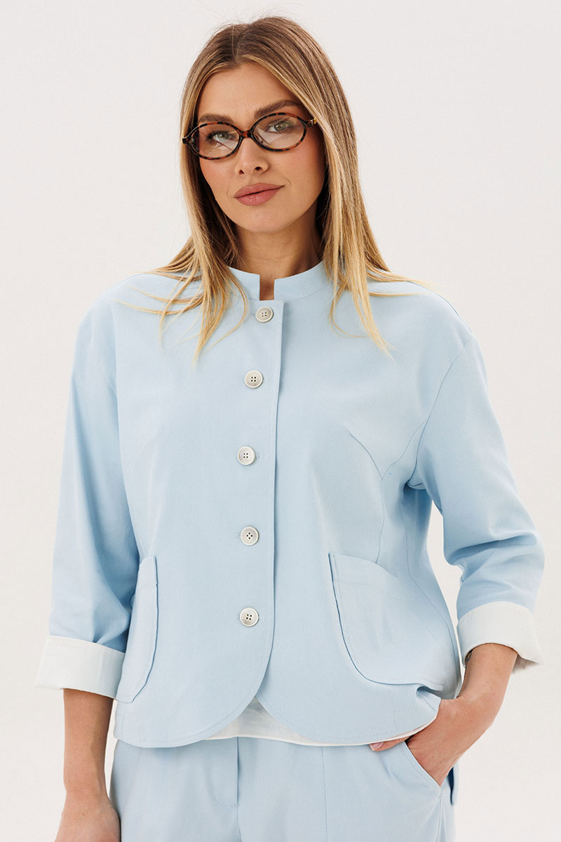 Жакет из натурального хлопка обеспечивает комфорт и отлично держит форму, подчёркивая аккуратный силуэт. Минималистичный дизайн с аккуратной линией горловины и пуговицами делает